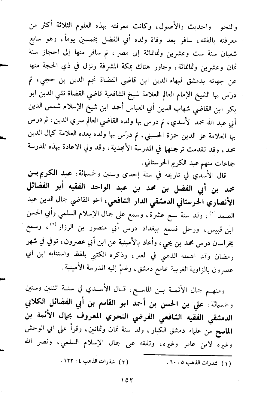 ومنهم جمال الأئمة بن الماسح قال الأسدي في سنة اثنتين وستين وخمسمائة: علي بن الحسن بن أحمد أبو القاسم بن أبي الفضائل الكلابي الدمشقي الفقيه الشافعي الفرضي النحوي المعروف بجمال الأئمة بن الماسح من علماء دمشق الكبار ولد سنة ثمان وثمانين وقرأ على أبي الوحش وغيره لابن عامر وغيره وتفقه على جمال الإسلام السلمي ونصر الله