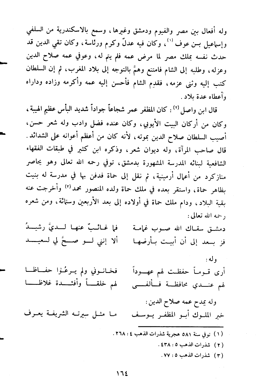 قال ابن واصل2: كان المظفر عمر شجاعا جوادا شديد البأس عظيم الهيبة وكان من اركان البيت الأيوبي وكان عنده فضل وأدب وله شعر حسن أصيب السلطان صلاح الدين بموته لأنه كان من اعظم اعوانه على الشدائد قال صاحب المرآة وله ديوان شعر وذكره ابن كثير في طبقات الفقهاء الشافعية لبنائه المدرسة المشهورة بدمشق توفي رحمه الله تعالى وهو يحاصر منازكرد من اعمال أرمينية ثم نقل إلى حماة فدفن بها في مدرسة له بنيت بظاهر حماة واستقر بعده في ملك حماة ولده المنصور محمد3 وأخرجت عنه بقية البلاد ودام ملك حماة في أولاده إلى بعد الاربعين وستمائة ومن شعره رحمه الله تعالى: