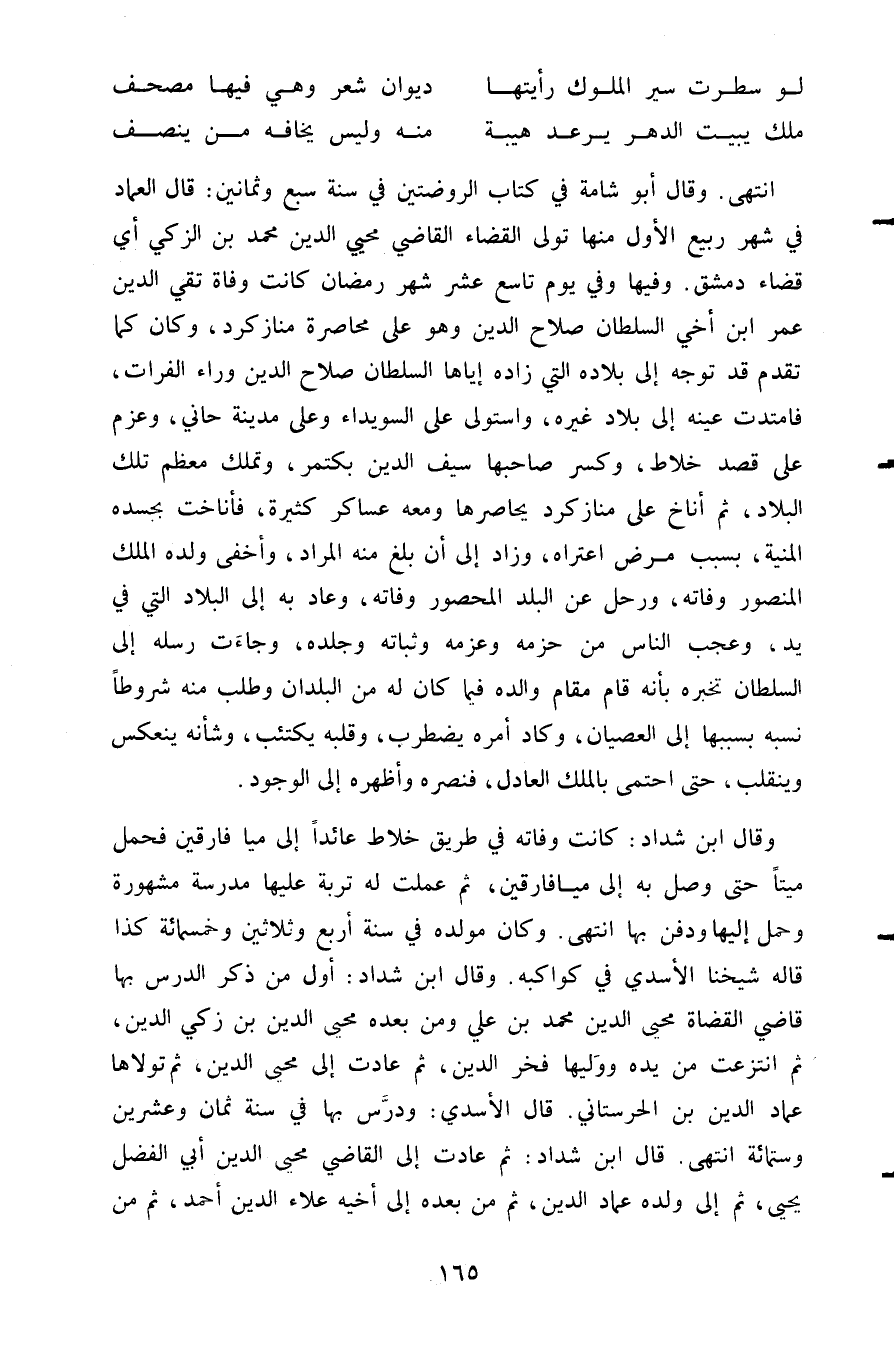 انتهى. وقال أبو شامة في كتاب الروضتين في سنة سبع وثمانين: قال العماد في شهر ربيع الأول منها تولى القضاء القاضي محيي الدين محمد بن الزكي أي قضاء دمشق. وفيها وفي يوم تاسع عشر شهر رمضان كانت وفاة تقي الدين عمر ابن أخي السلطان صلاح الدين وهو على محاصرة منازكرد وكان كما تقدم قد توجه إلى بلاده التي زاده إياها السلطان صلاح الدين وراء الفرات فامتدت عينه إلى بلاد غيره واستولى على السويداء وعلى مدينة حاني وعزم على قصد خلاط وكسر صاحبها سيف الدين بكتمر وتملك معظم تلك البلاد ثم أناخ على منازكرد يحاصرها ومعه عساكر كثيرة فأناخت بجسده المنية بسبب مرض اعتراه وزاد إلى أن بلغ منه المراد وأخفى ولده الملك المنصور وفاته ورحل عن البلد المحصور وفاته وعاد به إلى البلاد التي في يد وعجب الناس من حزمه وعزمه وثباته وجلده وجاءت رسله إلى السلطان تخبره بأنه قام مقام والده فيما كان له من البلدان وطلب منه شروطا نسبه بسببها إلى العصيان وكاد أمره يضطرب وقلبه يكتئب وشأنه ينعكس وينقلب حتى احتمى بالملك العادل فنصره واظهره إلى الوجود.