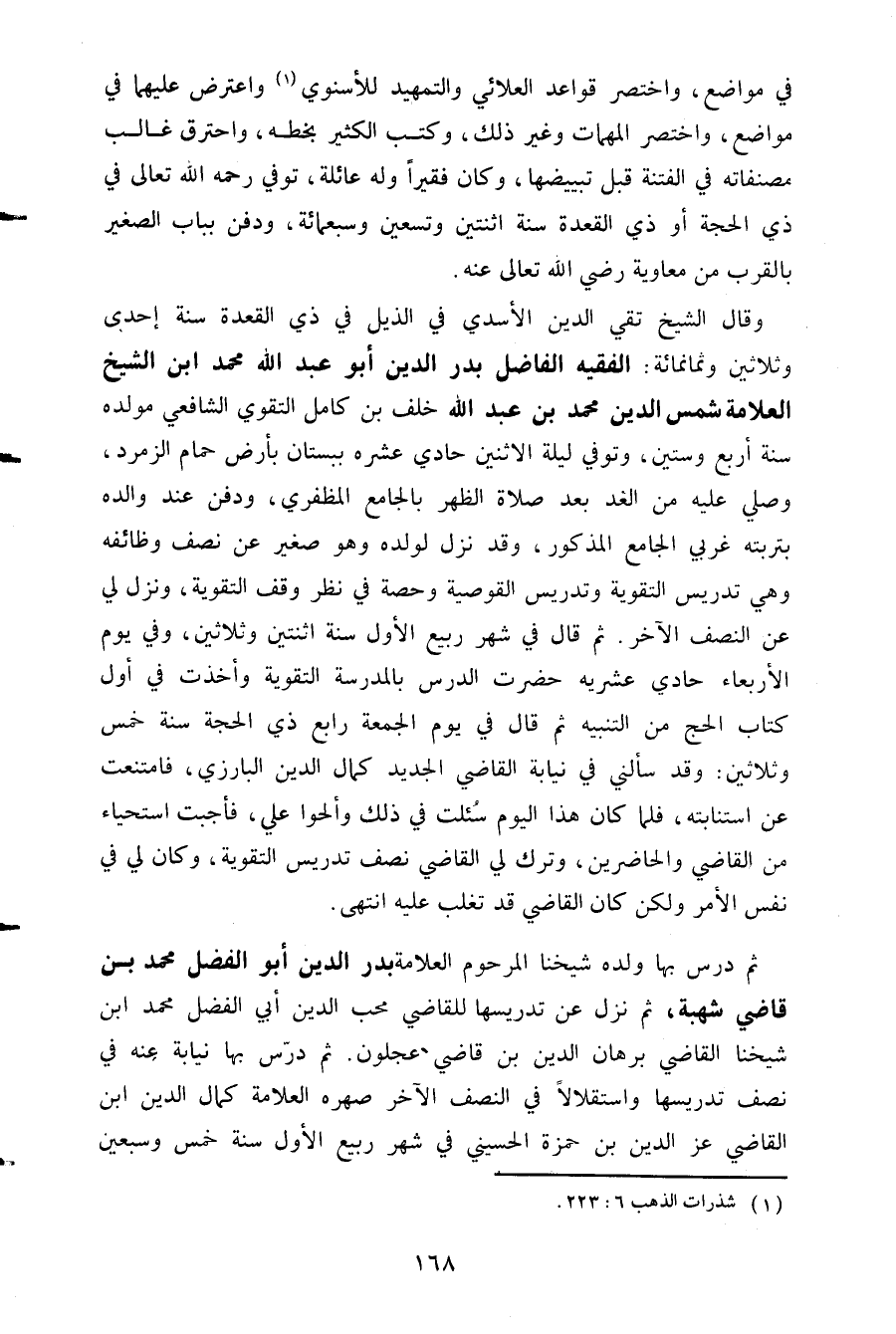 ثم درس بها ولده شيخنا المرحوم العلامة بدر الدين أبو الفضل محمد بن قاضي شهبة ثم نزل عن تدريسها للقاضي محب الدين أبي الفضل محمد ابن شيخنا القاضي برهان الدين بن قاضي عجلون ثم درس بها نيابة عنه في نصف تدريسها واستقلالا في النصف الآخر صهره العلامة كمال الدين ابن القاضي عز الدين بن حمزة الحسيني في شهر ربيع الأول سنة خمس وسبعين