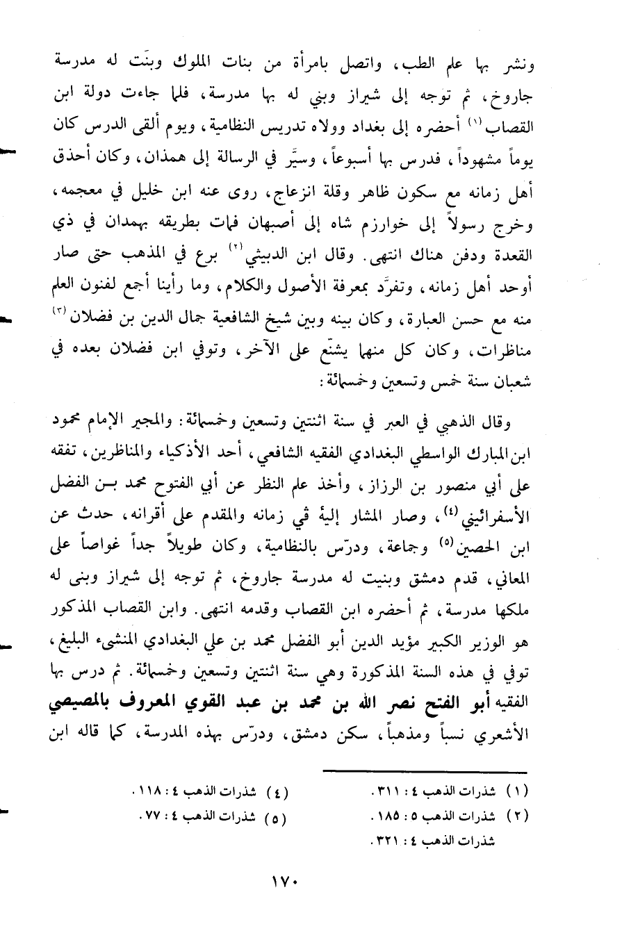 ونشر بها علم الطب واتصل بامرأة من بنات الملوك وبنت له مدرسة جاروخ ثم توجه إلى شيراز وبني له بها مدرسة فلما جاءت دولة ابن القصاب1 أحضره إلى بغداد وولاه تدريس النظامية ويوم ألقى الدرس كان يوما مشهودا فدرس بها اسبوعا وسير في الرسالة إلى همذان وكان أحذق أهل زمانه مع سكون ظاهر وقلة انزعاج روى عنه ابن خليل في معجمه وخرج رسولا إلى خوارزم شاه إلى أصبهان فمات بطريقه بهمدان في ذي القعدة ودفن هناك انتهى. وقال ابن الدبيثي2 برع في المذهب حتى صار أوحد أهل زمانه وتفرد بمعرفة الأصول والكلام وما رأينا أجمع لفنون العلم منه مع حسن العبارة وكان بينه وبين شيخ الشافعية جمال الدين بن فضلان3 مناظرات وكان كل منهما يشنع على الآخر وتوفي ابن فضلان بعده في شعبان سنة خمس وتسعين وخمسمائة.