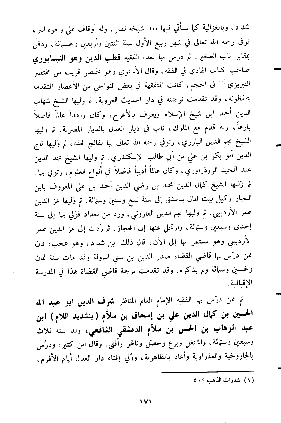 شداد وبالغزالية كما سيأتي فيها بعد شيخه نصر وله أوقاف على وجوه البر توفي رحمه الله تعالى في شهر ربيع الأول سنة اثنتين وأربعين وخمسمائة ودفن بمقابر باب الصغير ثم درس بها بعده الفقيه قطب الدين وهو النيسابوري صاحب كتاب الهادي في الفقه وقال الأسنوي وهو مختصر قريب من مختصر التبريزي1 في الحجم كانت المتفقهة في بعض النواحي من الأعصار المتقدمة يحفظونه وقد تقدمت ترجمته في دار الحديث العروية ثم وليها الشيخ شهاب االدين أحمد ابن شيخ الإسلام ويعرف بالأعرج وكان زاهدا عالما فاضلا بارعا وله قدم مع الملوك ناب في ديار العدل بالديار المصرية ثم وليها الشيخ نجم الدين البارزي وتوفي رحمه الله تعالى بها لفالج لحقه ثم وليها تاج الدين أبو بكر بن علي بن أبي طالب الإسكندري ثم وليها الشيخ مجد الدين عبد المجيد الروذراوري وكان عالما أديبا فاضلا في أنواع العلوم وتوفي بها ثم وليها الشيخ كمال الدين محمد بن رضي الدين أحمد بن علي المعروف بابن النجار وكيل بيت المال بدمشق إلى سنة تسع وستين وستمائة ثم وليها عز الدين عمر الأردبيلي ثم وليها نجم الدين الفاروثي ورد من بغداد فولي بها إلى سنة إحدى وسبعين وستمائة وارتحل عنها إلى الحجاز ثم ردت إلى عز الدين عمر الأردبيلي وهو مستمر بها إلى الآن قال ذلك ابن شداد وهو عجب فان ممن درس بها قاضي القضاة صدر الدين بن سني الدولة وقد مات سنة ثمان وخمسين وستمائة ولم يذكره وقد تقدمت ترجمة قاضي القضاة هذا في المدرسة الإقبالية.