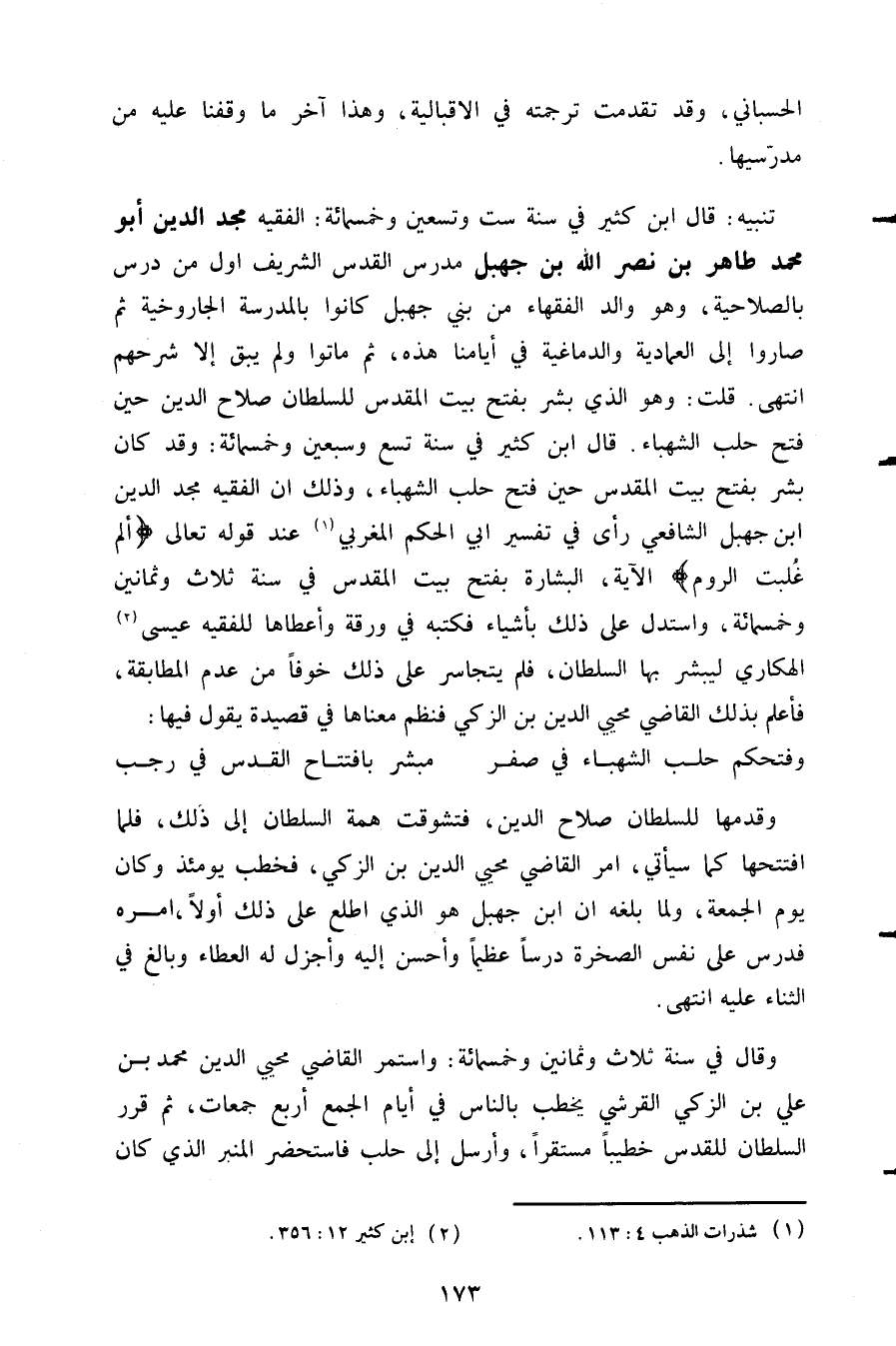 تنبيه: قال ابن كثير في سنة ست وتسعين وخمسمائة: الفقيه مجد الدين أبو محمد طاهر بن نصر الله بن جهبل مدرس القدس الشريف اول من درس بالصلاحية وهو والد الفقهاء من بني جهبل كانوا بالمدرسة الجاروخية ثم صاروا إلى العمادية والدماغية في أيامنا هذه ثم ماتوا ولم يبق إلا شرحهم انتهى قلت وهو الذي بشر بفتح بيت المقدس للسلطان صلاح الدين حين فتح حلب الشهباء قال ابن كثير في سنة تسع وسبعين وخمسمائة: وقد كان بشر بفتح بيت المقدس حين فتح حلب الشهباء وذلك ان الفقيه مجد الدين ابن جهبل الشافعي رأي في تفسير إبي الحكم المغربي1 عند قوله تعالى {ألم غُلِبَتِ الرُّومُ} الآية البشارة بفتح بيت المقدس في سنة ثلاث وثمانين وخمسمائة واستدل على ذلك بأشياء فكتبه في ورقة وأعطاها للفقيه عيسى2 الهكاري ليبشر بها السلطان فلم يتجاسر على ذلك خوفا من عدم المطابقة فأعلم بذلك القاضي محيي الدين بن الزكي فنظم معناها في قصيدة يقول فيها: