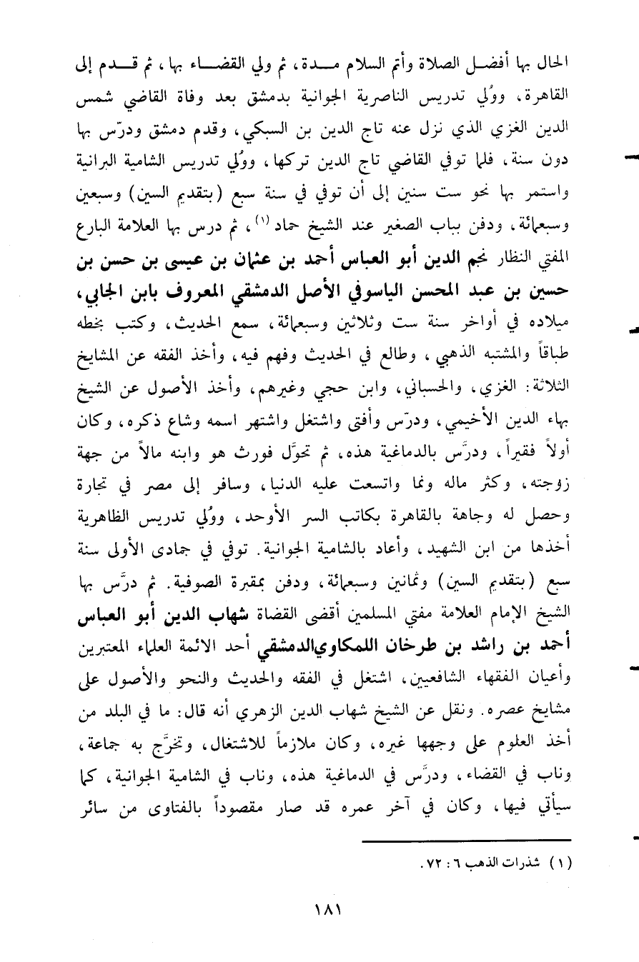 الحال بها أفضل الصلاة وأتم السلام مدة ثم ولي القضاء بها ثم قدم إلى القاهرة وولي تدريس الناصرية الجوانية بدمشق بعد وفاة القاضي شمس الدين الغزي الذي نزل عنه تاج الدين بن السبكي وقدم دمشق ودرس بها دون سنة فلما توفي القاضي تاج الدين تركها وولي تدريس الشامية البرانية واستمر بها نحو ست سنين إلى أن توفي في سنة سبع بتقديم السين وسبعين وسبعمائة ودفن بباب الصغير عند الشيخ حماد ثم درس بها العلامة البارع المفتي النظار نجم الدين أبو العباس أحمد بن عثمان بن عيسى بن حسن بن حسين بن عبد المحسن الياسوفي الأصل الدمشقي المعروف بابن الجابي ميلاده في أواخر سنة ست وثلاثين وسبعمائة سمع الحديث وكتب بخطه طباقا والمشتبه الذهبي وطالع في الحديث وفهم فيه وأخذ الفقه عن المشايخ الثلاثة الغزي والحسباني وابن حجي وغيرهم وأخذ الأصول عن الشيخ بهاء الدين الأخيمي ودرس وأفتى واشتغل واشتهر اسمه وشاع ذكره وكان أولا فقيرا ودرس بالدماغية هذه ثم تحول فورث فورت هو وابنه مالا من جهة زوجته وكثر ماله ونما واتسعت عليه الدنيا وسافر إلى مصر في تجارة وحصل له وجاهة بالقاهرة بكاتب السر الأوحد وولي تدريس الظاهرية أخذها من ابن الشهيد وأعاد بالشامية الجوانية توفي في جمادى الأولى سنة سبع بتقديم السين وثمانين وسبعمائة ودفن بمقبرة الصوفية ثم درس بها الشيخ الإمام العلامة مفتي المسلمين أقضى القضاة شهاب الدين أبو العباس أحمد بن راشد بن طرخان اللمكاوي الدمشقي أحد الائمة العلماء المعتبرين وأعيان الفقهاء الشافعيين اشتغل في الفقه والحديث والنحو والأصول على مشايخ عصره ونقل عن الشيخ شهاب الدين الزهري أنه قال ما في البلد من أخذ العلوم على وجهها غيره وكان ملازما للاشتغال وتخرج به جماعة وناب في القضاء ودرس في الدماغية هذه وناب في الشامية الجوانية كما سيأتي فيها وكان في آخر عمره قد صار مقصودا بالفتاوى من سائر