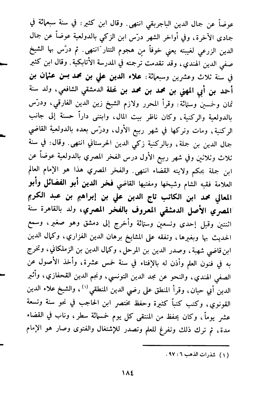عوضا عن جمال الدين الباجربقي انتهى. وقال ابن كثير في سنة سبعمائة: في جمادى الآخرة وفي أواخر الشهر درس ابن الزكي بالدولعية عوضا عن جمال الدين الزرعي لغيبته يعني خوفا من هجوم التتار انتهى. ثم درس بها الشيخ صفي الدين الهندي وقد تقدمت ترجمته في المدرسة الاتابكية وقال ابن كثير في سنة ثلاث وعشرين وسبعمائة: علاء الدين علي بن محمد بن عثمان بن أحمد بن أبي المهني بن محمد بن محمد بن نحلة الدمشقي الشافعي ولد سنة ثمان وخمسين وستمائة وقرأ المحرر ولازم الشيخ زين الدين الفارقي ودرس بالدولعية والركنية وكان ناظر بيت المال وابتنى دارا حسنة إلى جانب الركنية ومات وتركها في شهر ربيع الاول ودرس بعده بالدولعية القاضي جمال الدين بن جملة وبالركنية زكي الدين الحرستاني انتهى. وقال في سنة ثلاث وثلاثين: وفي شهر ربيع الاول درس الفخر المصري بالدولعية عوضا عن ابن جملة بحكم ولايته القضاء انتهى. والفخر المصري هذا هو الامام العالم العلامة فقيه الشام وشيخها ومفتيها القاضي فخر الدين أبو الفضائل وأبو المعالي محمد ابن الكاتب تاج الدين علي بن إبراهيم بن عبد الكريم المصري الأصل الدمشقي المعروف بالفخر المصري ولد بالقاهرة سنة اثنتين وقيل إحدى وتسعين وستمائة وأخرج إلى دمشق وهو صغير وسمع الحديث بها وبغيرها وتفقه على المشايخ برهان الدين الفزاري وكمال الدين ابن قاضي شهبة وصدر الدين بن المرحل وكمال الدين بن الزملكاني وتخرج به في فنون العلم وأذن له بالإفتاء في سنة خمس عشرة وأخذ الأصول عن الصفي الهندي والنحو عن مجد الدين التونسي ونجم الدين القحفازي وأثير الدين أبي حيان وقرأ المنطق على رضي الدين المنطقي1 والشيخ علاء الدين القونوي وكتب كتبا كثيرة وحفظ مختصر ابن الحاجب في نحو سنة وتسعة عشر يوما وكان يحفظ من المنتقى كل يوم خمسمائة سطر وناب في القضاء مدة ثم ترك ذلك وتفرغ للعلم وتصدر للإشتغال والفتوى وصار هو الإمام
