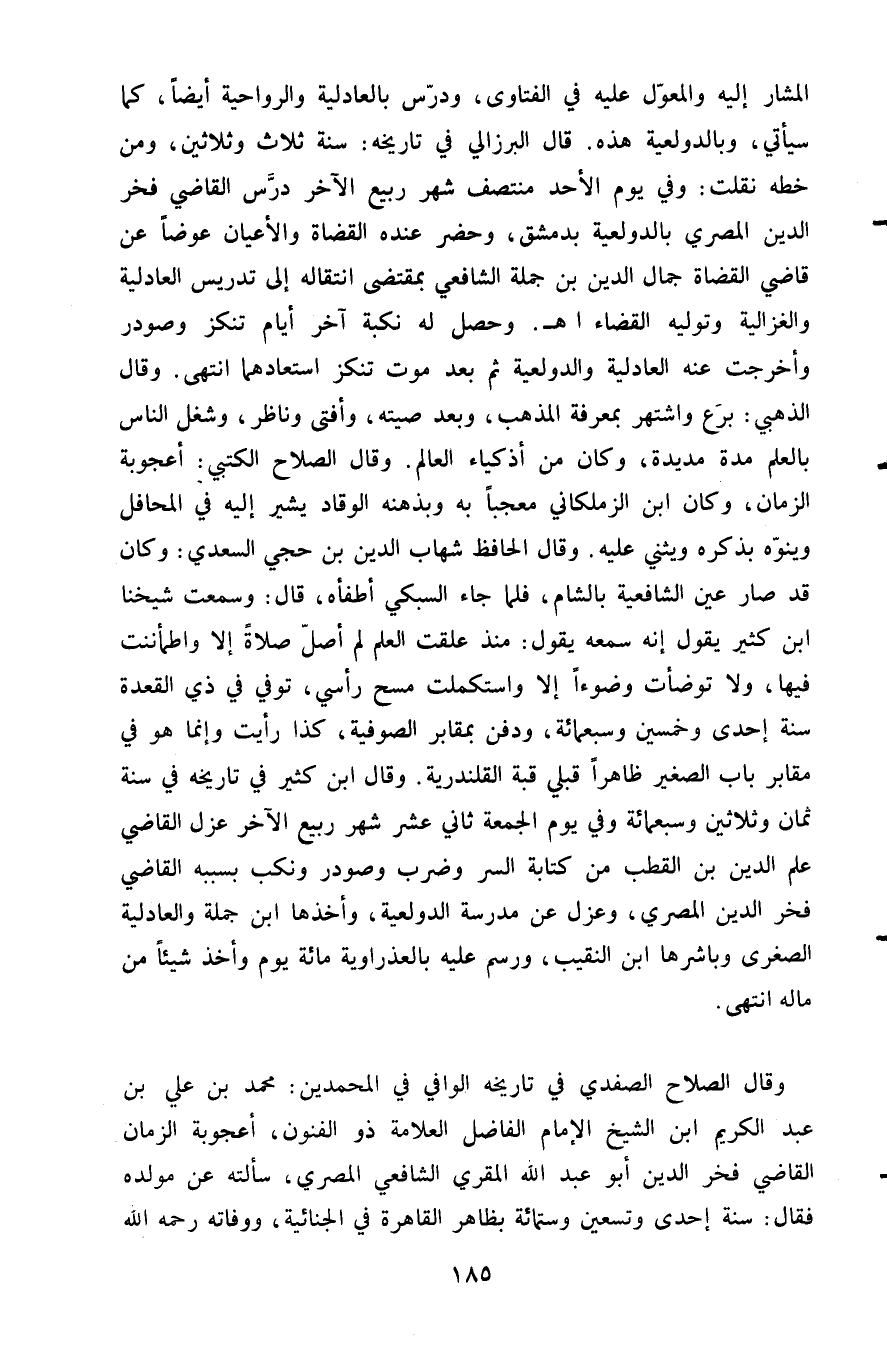 المشار إليه والمعول عليه في الفتاوى ودرس بالعادلية والرواحية أيضا كما سيأتي وبالدولعية هذه قال البرزالي في تاريخه سنة ثلاث وثلاثين ومن خطه نقلت وفي يوم الإحد منتصف شهر ربيع الآخر درس القاضي فخر الدين المصري بالدولعية بدمشق وحضر عنده القضاة والاعيان عوضا عن قاضي القضاة جمال الدين بن جملة الشافعي بمقتضى انتقاله إلى تدريس العادلية والغزالية وتولية القضاء اهـ وحصل له نكبة آخر أيام تنكز وصودر وأخرجت عنه العادلية والدولعية ثم بعد موت تنكز استعادهما انتهى وقال الذهبي: برع واشتهر بمعرفة المذهب وبعد صيته وأفتى وناظر وشغل الناس بالعلم مدة مديدة وكان من أذكياء العالم وقال الصلاح الكتبي أعجوبة الزمان وكان ابن الزملكاني معجبا به وبذهنه الوقاد يشير إليه في المحافل وينوه بذكره ويثني عليه وقال الحافظ شهاب الدين بن حجي السعدي وكان قد صار عين الشافعية بالشام فلما جاء السبكي أطفأه قال وسمعت شيخنا ابن كثير يقول إنه سمعه يقول منذ علقت العلم لم أصل صلاة إلا واطمأننت فيها ولا توضأت وضوءا إلا واستكملت مسح رأسي توفي في ذي القعدة سنة إحدى وخمسين وسبعمائة ودفن بمقابر الصوفية كذا رأيت وإنما هو في مقابر باب الصغير ظاهرا قبلي قبة القلندرية وقال ابن كثير في تاريخه في سنة ثمان وثلاثين وسبعمائة: وفي يوم الجمعة ثاني عشر شهر ربيع الآخر عزل القاضي علم الدين بن القطب من كتابة السر وضرب وصودر ونكب بسببه القاضي فخر الدين المصري وعزل عن مدرسة الدولعية وأخذها ابن جملة والعادلية الصغرى وباشرها ابن النقيب ورسم عليه بالعذراوية مائة يوم وأخذ شيئا من ماله انتهى.