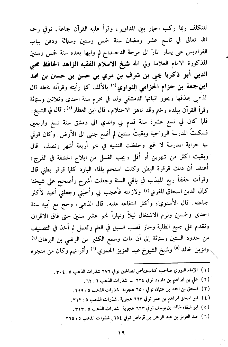 للتكلف ربما ركب الحمار بين المداوير وقرأ عليه القرآن جماعة توفي رحمة الله تعالى في تاسع عشر رمضان سنة خمس وستين وستمائة ودفن بباب الفراديس على يسار المار إلى مرجة الدحداح ثم وليها بعده سنة خمس وستين المذكورة الأمام العلامة ولي الله شيخ الأسلام الفقيه الزاهد الحافظ محيي الدين أبو ذكريا يحيى بن شرف بن مري بن حسن بن حسين بن محمد ابن جمعة بن الحزامي الحزمي النواوي 1 بالألف كما رأيته وقرأته بخطه قال الذهبي بحدفها ويجوز اثباتها الدمشقي ولد في محرم سنة إحدى وثلاثين وستمائة وقرأ القرآن ببلده وختم وقد ناهز الاحتلام قال أبن العطار2 قال لي الشيخ فلما كان لي تسع عشرة سنة قدم بي والدي إلى دمشق سنة تسع وأربعين فسكنت المدرسة الرواحية وبقيت سنتين لم أضع جنبي إلى الأرض وكان قوتي بها جراية المدرسة لا غير وحفظت التنبيه في نحو أربعة أشهر ونصف قال وبقيت أكثر من شهرين أو أقل يجب الغسل من إيلاج الحشفة في الفرج أعتقد أن ذلك قرقرة البطن وكنت أستحم بالماء البارد كلما قرقر بطني قال وقرأت حفظا ربع المهذب في باقي السنة وجعلت أشرح وأصحح على شيخنا كمال الدين إسحاق المغربي3 ولازمته فأعجب بي وأحبني وجعلني أعيد لأكثر جماعته قال الأسنوي وأكثر انتفاعه عليه قال الذهبي وحج مع أبيه سنة إحدى وخمسين ولزم الاشتغال ليلا ونهارا نحو عشر سنين حتى فاق الأقران وتقدم على جميع الطلبة وحاز قصب السبق في العلم والعمل ثم أخذ في التصنيف من حدود الستين وستمائة إلى أن مات وسمع الكثير من الرضي بن البرهان4 والزين خالد5 وشيخ الشيوخ عبد العزيز الحموي6 وأقرانهم وكان من متجره