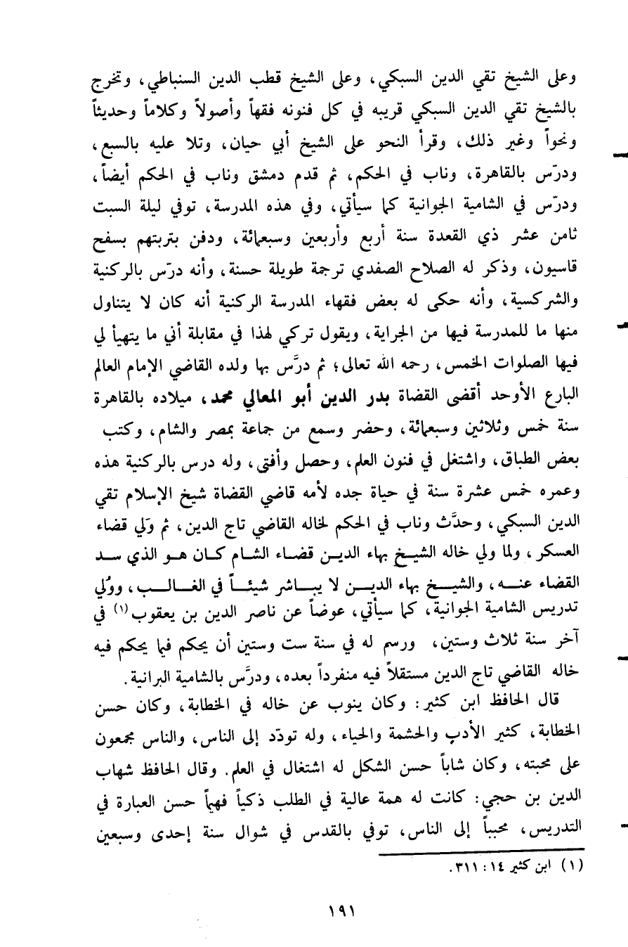 وعلى الشيخ تقي الدين السبكي وعلى الشيخ قطب الدين السنباطي وتخرج بالشيخ تقي الدين قريبه في كل فنونه فقها وأصولا وكلاما وحديثا ونحوا وغير ذلك وقرأ النحو على الشيخ أبي حيان وتلا عليه بالسبع ودرس بالقاهرة وناب في الحكم ثم قدم دمشق وناب في الحكم أيضا ودرس في الشامية الجوانية كما سيأتي وفي هذه المدرسة توفي ليلة السبت ثامن عشر ذي القعدة سنة أربع وأربعين وسبعمائة ودفن بتربتهم بسفح قاسيون وذكر له الصلاح الصفدي ترجمه طويلة حسنة وأنه درس بالركنية والشركسية وأنه حكى له بعض فقهاء المدرسة الركنية أنه كان لا يتناول منها ما للمدرسة فيها من الجراية ويقول تركي لهذا في مقابلة أني ما يتهيأ لي فيها الصلوات الخمس رحمه الله تعالى ثم درس بها ولده القاضي الإمام العالم البارع الأوحد أقضى القضاة بدر الدين أبو المعالي محمد ميلاده بالقاهرة سنة خمس وثلاثين وسبعمائة وحضر وسمع من جماعة بمصر والشام وكتب بعض الطباق واشتغل في فنون العلم وحصل وأفتى وله درس بالركنية هذه وعمره خمس عشرة سنة في حياة جده لأمه قاضي القضاة شيخ الإسلام تقي الدين السبكي وحدث وناب في الحكم لخاله القاضي تاج الدين ثم ولي قضاء العسكر ولما ولي خاله الشيخ بهاء الدين قضاء الشام كان هو الذي سد القضاء عنه والشيخ بهاء الدين لايباشر شيئا في الغالب وولي تدريس الشامية الجوانية كما سيأتي عوضا عن ناصر الدين بن يعقوب1 في آخر سنة ثلاث وستين ورسم له في سنة ست وستين أن يحكم فيما يحكم فيه خاله القاضي تاج الدين مستقلا فيه منفردا بعده ودرس بالشامية البرانية.