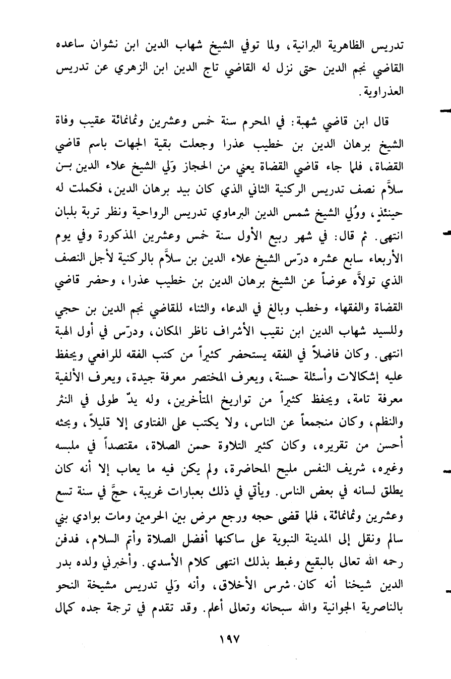 قال ابن قاضي شهبة: في المحرم سنة خمس وعشرين وثمانمائة عقيب وفاة الشيخ برهان الدين بن خطيب عذرا وجعلت بقية الجهات باسم قاضي القضاة فلما جاء قاضي القضاة يعني من الحجاز ولي الشيخ علاء الدين بن سلام نصف تدريس الركنية الثاني الذي كان بيد برهان الدين فكملت له حينئذ وولي الشيخ شمس الدين البرماوي تدريس الرواحية ونظر تربة بلبان انتهى ثم قال في شهر ربيع الأول سنة خمس وعشرين المذكورة وفي يوم الأربعاء سابع عشرة درس الشيخ علاء الدين بن سلام بالركنية لأجل النصف الذي تولاه عوضا عن الشيخ برهان الدين بن خطيب عذرا وحضر قاضي القضاة والفقهاء وخطب وبالغ في الدعاء والثناء للقاضي نجم الدين بن حجي وللسيد شهاب الدين ابن نقيب الأشراف ناظر المكان ودرس في أول الهبة انتهى وكان فاضلا في الفقه يستحضر كثيرا من كتب الفقه للرافعي ويحفظ عليه إشكالات وأسئلة حسنة ويعرف المختصر معرفة جيدة ويعرف الألفية معرفة تامة ويحفظ كثيرا من تواريخ المتأخرين وله يد طولى في النثر والنظم وكان منجمعا عن الناس ولا يكتب على الفتاوى إلا قليلا وبحثه أحسن من تقريره وكان كثير التلاوة حسن الصلاة مقتصدا في ملبسه وغيره شريف النفس مليح المحاضرة ولم يكن فيه ما يعاب إلا أنه كان يطلق لسانه في بعض الناس. ويأتي في ذلك بعبارات غريبة حج في سنة تسع وعشرين وثمانمائة فلما قضى حجة ورجع مرض بين الحرمين ومات بوادي بني سالم ونقل إلى المدينة النبوية على ساكنها أفضل الصلاة وأتم السلام فدفن رحمه الله تعالى بالبقيع وغبط بذلك انتهى. كلام الأسدي وأخبرني ولده بدر الدين شيخنا أنه كان شرس الأخلاق وأنه ولي تدريس مشيخة النحو بالناصرية الجوانية والله سبحانه وتعالى أعلم وقد تقدم في ترجمة جده كمال