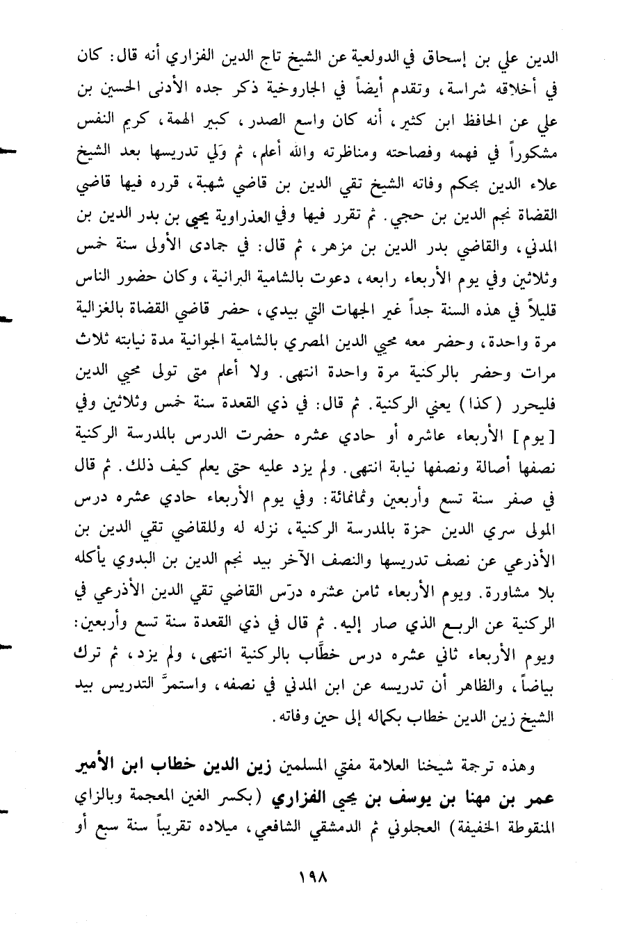 وهذه ترجمة شيخنا العلامة مفتي المسلمين زين الدين خطاب ابن الأمير عمر بن مهنا بن يوسف بن يحيى الفزاري بكسر الغين المعجمة وبالزاي المنقوطة الخفيفة العجلوني ثم الدمشقي الشافعي ميلاده تقريبا سنة سبع أو