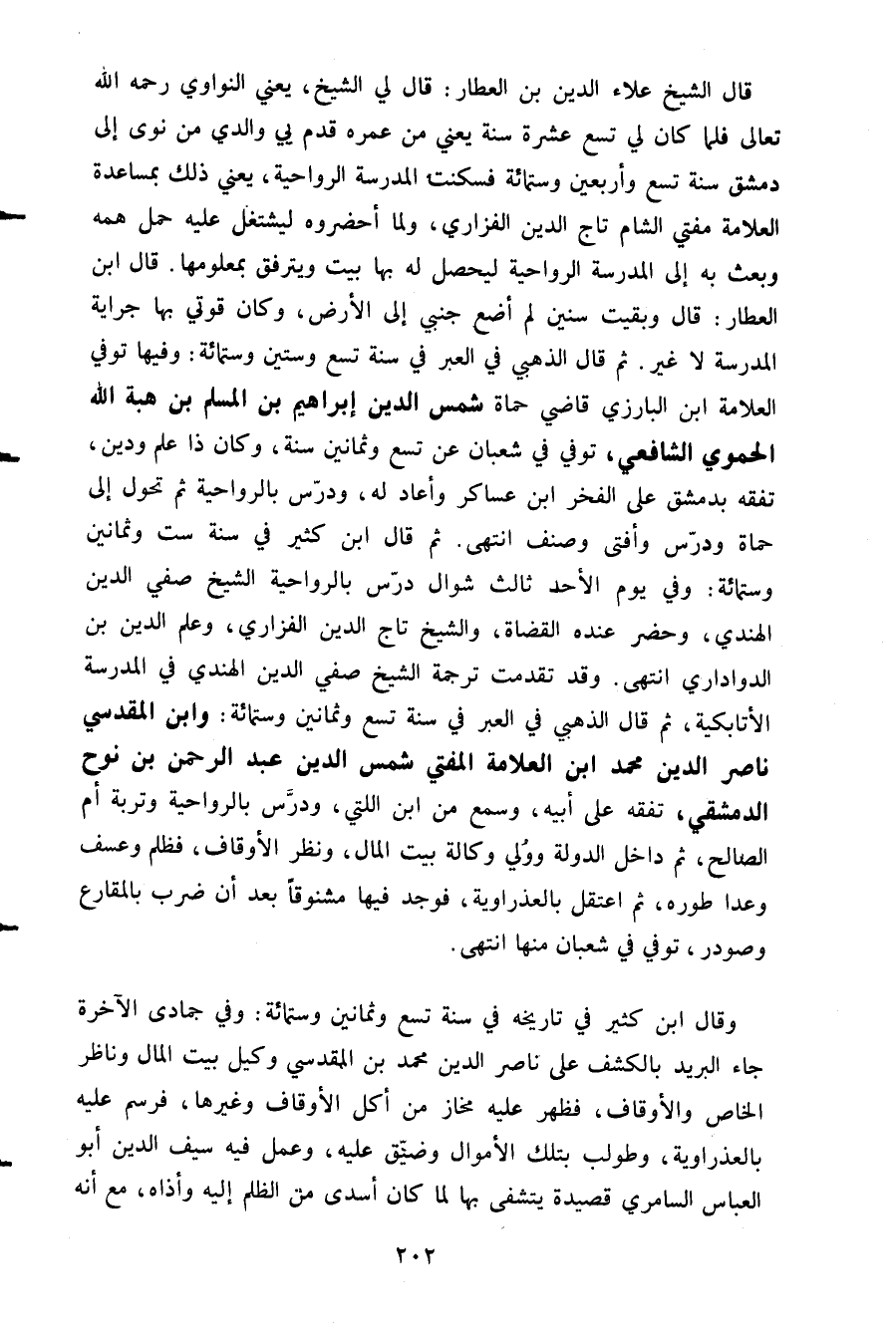 قال الشيخ علاء الدين بن العطار: قال لي الشيخ يعني النواوي رحمه الله تعالى فلما كان لي تسع عشرة سنة يعني من عمره قدم بي والدي من نوى إلى دمشق سنة تسع وأربعين وستمائة فسكنت المدرسة الرواحية يعني ذلك بمساعدة العلامة مفتي الشام تاج الدين الفزاري ولما أحضروه ليشتغل عليه حمل همه وبعث به إلى المدرسة الرواحية ليحصل له بها بيت ويترفق بمعلومها قال ابن العطار: قال وبقيت سنين لم أضع جنبي إلى الأرض وكان قوتي بها جراية المدرسة لاغير ثم قال الذهبي في العبر في سنة تسع وستين وستمائة: وفيها توفي العلامه ابن البارزي قاضي حماة شمس الدين إبراهيم بن المسلم بن هبة الله الحموي الشافعي توفي في شعبان عن تسع وثمانين سنة وكان ذا علم ودين تفقه بدمشق على الفخر ابن عساكر وأعاد له ودرس بالرواحية ثم تحول إلى حماة ودرس وأفتى وصنف انتهى. ثم قال ابن كثير في سنة ست وثمانين وستمائة: وفي يوم الاحد ثالث شوال درس بالرواحية الشيخ صفي الدين الهندي وحضر عنده القضاة والشيخ تاج الدين الفزاري وعلم الدين بن الدواداري انتهى. وقد تقدمت ترجمة الشيخ صفي الدين الهندي في المدرسة الاتابكية ثم قال الذهبي في العبر: في سنة تسع وثمانين وستمائة وابن المقدسي ناصر الدين محمد ابن العلامة المفتي شمس الدين عبد الرحمن بن نوح الدمشقي تفقه على ابيه وسمع من ابن اللتي ودرس بالرواحية وتربة أم الصالح ثم داخل الدولة وولي وكالة بيت المال ونظر الأوقاف فظلم وعسف وعدا طوره ثم أعتقل بالعذراوية فوجد فيها مشنوقا بعد أن ضرب بالمقارع وصودر توفي في شعبان منها انتهى.