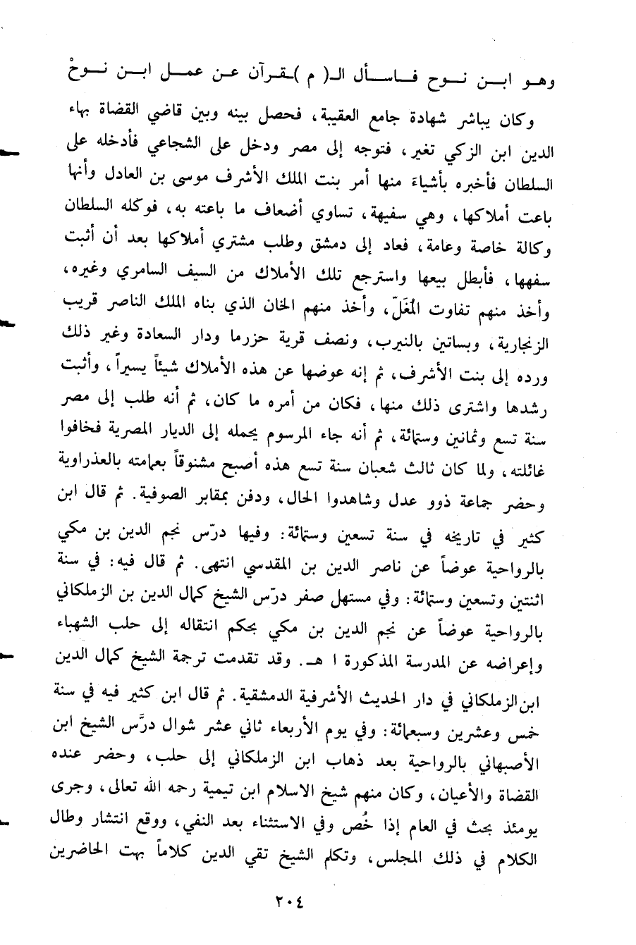 وكان يباشر شهادة جامع العقيبة فحصل بينه وبين قاضي القضاة بهاء الدين ابن الزكي تغير فتوجه إلى مصر ودخل على الشجاعي فأدخله على السلطان فأخبره بأشياء منها أمر بنت الملك الأشرف موسى بن العادل وأنها باعت أملاكها وهي سفيهة تساوي أضعاف ما باعته به فوكله السلطان وكالة خاصة وعامة فعاد إلى دمشق وطلب مشتري أملاكها بعد أن أثبت سفهها فأبطل بيعها واسترجع تلك الأملاك من السيف السامري وغيره وأخذ منهم تفاوت المغل وأخذ منهم الخان الذي بناه الملك الناصر قريب الزنجارية وبساتين بالنيرب ونصف قرية حزرما ودار السعادة وغير ذلك ورده إلى بنت الأشرف ثم إنه عوضها عن هذه الأملاك شيئا يسيرا وأثبت رشدها واشترى ذلك منها فكان من أمره ماكان ثم أنه طلب إلى مصر سنة تسع وثمانين وستمائة ثم أنه جاء المرسوم يحمله إلى الديار المصرية فخافوا غائلته ولما كان ثالث شعبان سنة تسع هذه أصبح مشنوقا بعمامته بالعذراوية وحضر جماعة ذوو عدل وشاهدوا الحال ودفن بمقابر الصوفية ثم قال ابن كثير في تاريخه في سنة تسعين وستمائة: وفيها درس نجم الدين بن مكي بالرواحية عوضا عن ناصر الدين بن المقدسي انتهى. ثم قال فيه في سنة اثنتين وتسعين وستمائة: وفي مستهل صفر درس الشيخ كمال الدين بن الزملكاني بالرواحية عوضا عن نجم الدين بن مكي بحكم انتقاله إلى حلب الشهباء وإعراضه عن المدرسة المذكورة وقد تقدمت ترجمة الشيخ كمال الدين ابن الزملكاني في دار الحديث الأشرفية الدمشقية ثم قال ابن كثير فيه في سنة خمس وعشرين وسبعمائة: وفي يوم الأربعاء ثاني عشر شوال درس الشيخ ابن الأصبهاني بالرواحية بعد ذهاب ابن الزملكاني إلى حلب وحضر عنده القضاة والأعيان وكان منهم شيخ الإسلام ابن تيمية رحمه الله تعالى وجرى يومئذ بحث في العام إذا خص وفي الاستثناء بعد النفي ووقع انتشار وطال الكلام في ذلك المجلس وتكلم الشيخ تقي الدين كلاما بهت الحاضرين