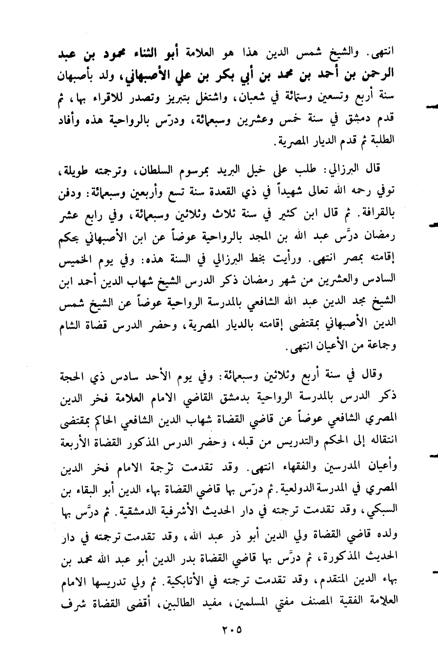انتهى. والشيخ شمس الدين هذا هو العلامة أبو الثناء محمود بن عبد الرحمن بن أحمد بن محمد بن أبي بكر بن علي الأصبهاني ولد بأصبهان سنة أربع وتسعين وستمائة في شعبان واشتغل بتبريز وتصدر للاقراء بها ثم قدم دمشق في سنة خمس وعشرين وسبعمائة ودرس بالرواحية هذه وأفاد الطلبة ثم قدم الديار المصرية.