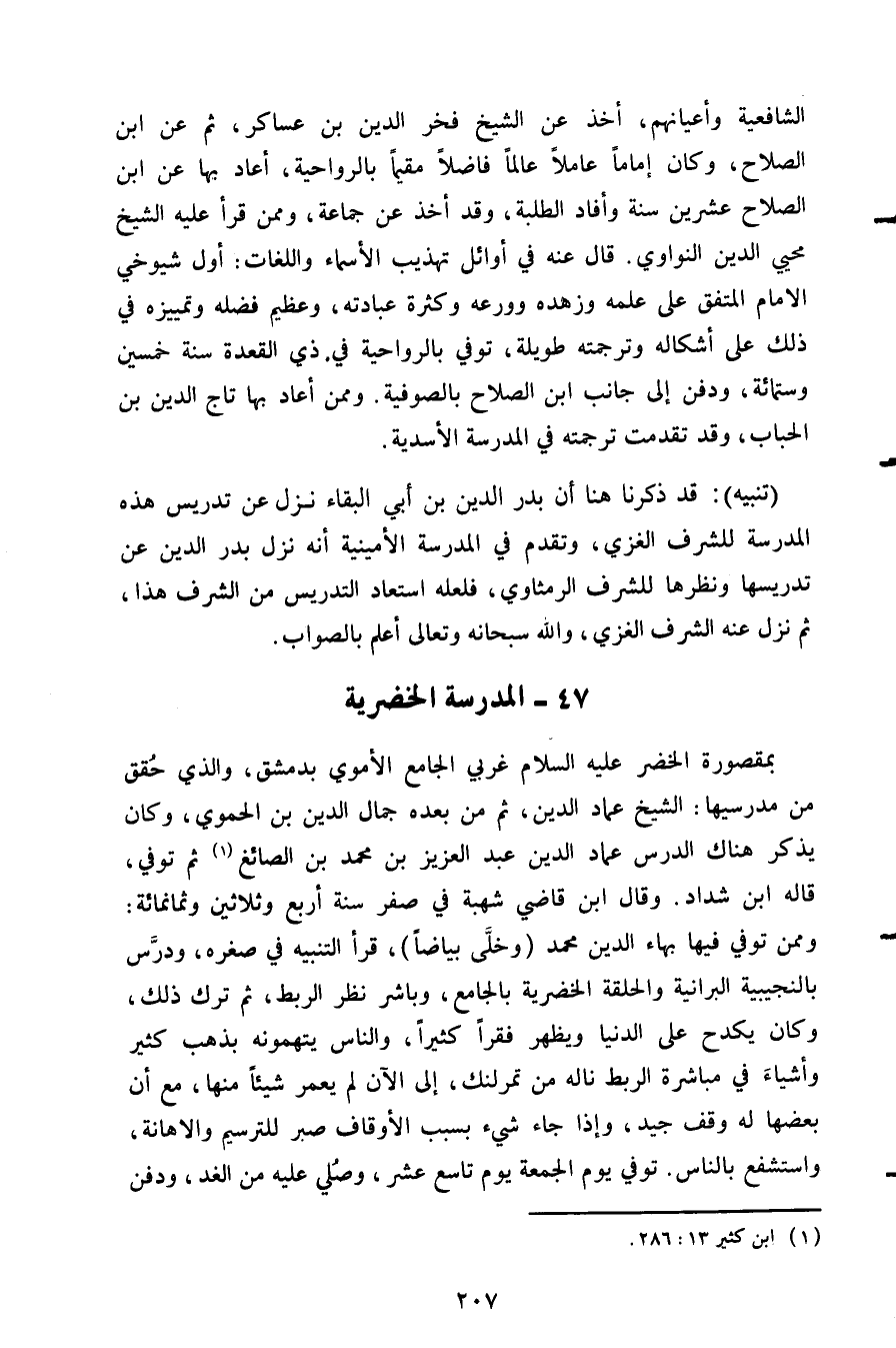 الشافعية وأعيانهم أخذ عن الشيخ فخر الدين بن عساكر ثم عن ابن الصلاح وكان اماما عاملا فاضلا مقيما بالرواحيه أعاد بها عن ابن الصلاح عشرين سنة وأفادة الطلبة وقد أخذ عن جماعة وممن قرأ عليه الشيخ محيي الدين النواوي. قال عنه في أوائل تهذيب الأسماء واللغات: أول شيوخي الإمام المتفق على علمه وزهده وورعه وكثرة عبادته وعظيم فضله وتمييزه في ذلك على أشكاله وترجمته طويلة توفي بالرواحية في ذي القعدة سنة خمسين وستمائة ودفن إلى جانب ابن الصلاح بالصوفية وممن اعاد بها تاج الدين بن الحباب وقد تقدمت ترجمته في المدرسة الأسدية.