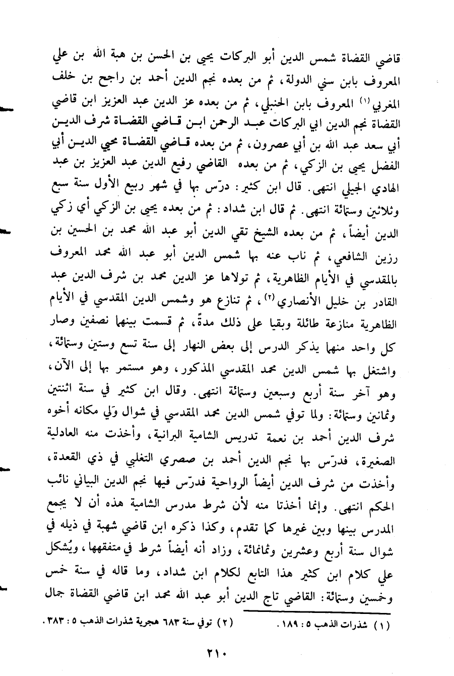 قاضي القضاة شمس الدين أبو البركات يحيى بن الحسن بن هبة الله بن علي المعروف بابن سني الدولة ثم من بعده نجم الدين أحمد بن راجح بن خلف المغربي المعروف بابن الحنبلي ثم من بعده عز الدين عبد العزيز ابن قاضي القضاة نجم الدين ابي البركات عبد الرحمن ابن قاضي القضاة شرف الدين أبي سعد عبد الله بن أبي عصرون ثم من بعده قاضي القضاة محيي الدين أبي الفضل يحيى بن الزكي ثم من بعده القاضي رفيع الدين عبد العزيز بن عبد الهادي الجيلي انتهى قال ابن كثير درس بها في شهر ربيع الأول سنة سبع وثلاثين وستمائة انتهى ثم قال ابن شداد ثم من بعده يحيى بن الزكي أي زكي الدين أيضا ثم من بعده الشيخ تقي الدين أبو عبد الله محمد بن الحسين بن رزين الشافعي ثم ناب عنه بها شمس الدين أبو عبد الله محمد المعروف بالمقدسي في الأيام الظاهرية ثم تولاها عز الدين محمد بن شرف الدين عبد القادر بن خليل الأنصاري ثم تنازع هو وشمس الدين المقدسي في الأيام الظاهرية منازعة طائلة وبقيا على ذلك مدة ثم قسمت بينهما نصفين وصار كل واحد منهما يذكر الدرس إلى بعض النهار إلى سنة تسع وستين وستمائة واشتغل بها شمس الدين محمد المقدسي المذكور وهو مستمر بها إلى الآن وهو آخر سنة أربع وسبعين وستمائة انتهى وقال ابن كثير في سنة اثنتين وثمانين وستمائة ولما توفي شمس الدين محمد المقدسي في شوال ولي مكانه أخوه شرف الدين أحمد بن نعمة تدريس الشامية البرانية وأخذت منه العادلية الصغيرة فدرس بها نجم الدين أحمد بن صصري التغلبي في ذي القعدة وأخذت من شرف الدين أيضا الرواحية فدرس فيها نجم الدين البياني نائب الحكم انتهى وإنما أخذتا منه لأن شرط مدرس الشامية هذه أن لا يجمع المدرس بينها وبين غيرها كما تقدم وكذا ذكره ابن قاضي شهبة في ذيله في شوال سنة أربع وعشرين وثمانمائة وزاد أنه أيضا شرط في متفقهها ويشكل علي كلام ابن كثير هذا التابع لكلام ابن شداد وما قاله في سنة خمس وخمسين وستمائة القاضي تاج الدين أبو عبد الله محمد ابن قاضي القضاة جمال