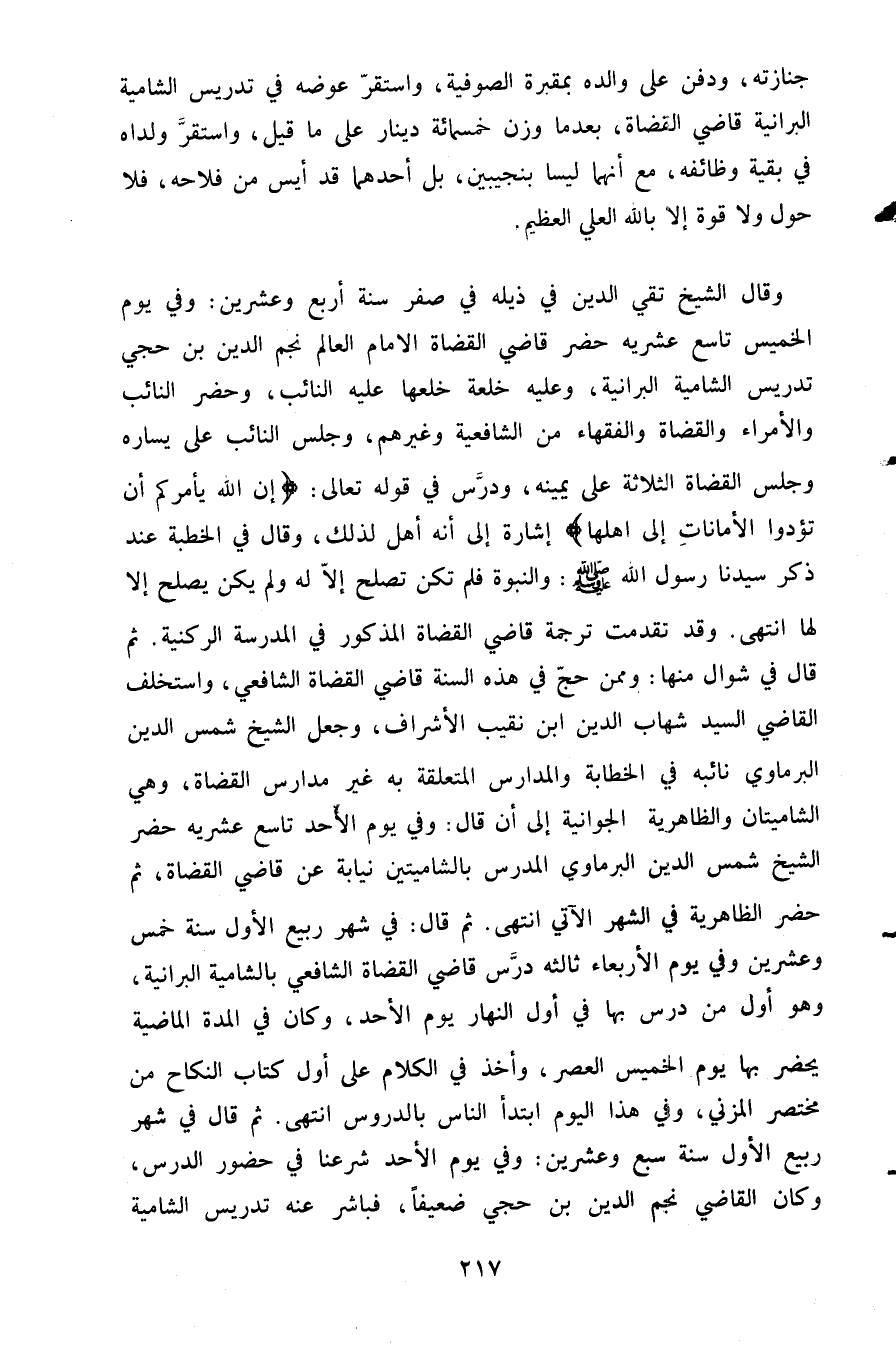 وقال الشيخ تقي الدين في ذيله في صفر سنة أربع وعشرين وفي يوم الخميس تاسع عشريه حضر قاضي القضاة الإمام العالم نجم الدين بن حجي تدريس الشامية البرانية وعليه خلعة خلعها عليه النائب وحضر النائب والأمراء والقضاة والفقهاء من الشافعية وغيرهم وجلس النائب على يساره وجلس القضاة الثلاثة على يمينه ودرس في قوله تعالى {إن الله يأمركم أن تؤدوا الأمانات إلى أهلها} إشارة إلى أنه أهل لذلك وقال في الخطبة عند ذكر سيدنا رسول الله صَلَّى اللَّهُ عَلَيْهِ وَسَلَّمَ والنبوة فلم تكن تصلح إلا له ولم يكن يصلح إلا لها انتهى وقد تقدمت ترجمه قاضي القضاة المذكور في المدرسة الركنية ثم قال في شوال منها وممن حج في هذه السنه قاضي القضاه الشافعي واستخلف القاضي السيد شهاب الدين ابن نقيب الأشراف وجعل الشيخ شمس الدين البرماوي نائبه في الخطابة والمدارس المتعلقة به غير مدارس القضاة وهي الشاميتان والظاهرية الجوانية إلى أن قال وفي يوم الأحد تاسع عشرية حضر الشيخ شمس الدين البرماوي المدرس بالشاميتين نيابة عن قاضي القضاة ثم حضر الظاهرية في الشهر الآتي انتهى ثم قال في شهر ربيع الأول سنة خمس وعشرين وفي يوم الأربعاء ثالثة درس قاضي القضاة الشافعي بالشامية البرانية وهو أول من درس بها في أول النهار يوم الأحد وكان في المده الماضية يحضر بها يوم الخميس العصر وأخذ في الكلام على أول كتاب النكاح من مختصر المزني وفي هذا اليوم ابتدأ الناس بالدروس انتهى ثم قال في شهر ربيع الأول سنة سبع وعشرين وفي يوم الأحد شرعنا في حضور الدرس وكان القاضي نجم الدين بن حجي ضعيفا فباشر عنه تدريس الشامية