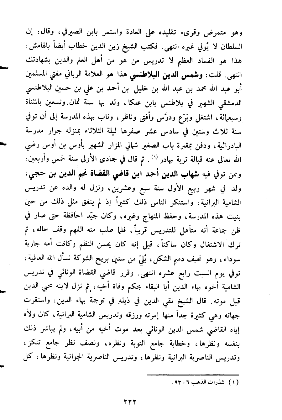 وهو متمرض وقرىء تقليده على العادة واستمر بابن الصيرفي وقال إن السلطان لا يولي غيره انتهى فكتب الشيخ زين الدين خطاب أيضا بالهامش هذا هو الفساد العظيم لا تدريس من هو من أهل العلم والدين بشهادتك انتهى قلت وشمس الدين البلاطنسي هذا هو العلامة الرباني مفتي المسلمين أبو عبد الله محمد بن عبد الله بن خليل بن أحمد بن علي بن حسين البلاطنسي الدمشقي الشهير في بلاطنس بابن عكا ولد بها سنة ثمان وتسعين بالمثناة وسبعمائة اشتغل وبرع ودرس وأفتى وناظر وناب بهذه المدرسة إلى أن توفي سنة ثلاث وستين في سادس عشر صفرها ليلة الثلاثاء بمنزله جوار مدرسة البادرائية ودفن بمقبرة باب الصغير شمالي المزار الشهير بأوس بن أوس رضي الله تعالى عنه قباله تربة بهادر ثم قال في جمادى الأولى سنة خمس وأربعين وممن توفي فيه شهاب الدين أحمد ابن قاضي القضاة نجم الدين بن حجي ولد في شهر ربيع الأول سنة سبع وعشرين ونزل له والده عن تدريس الشامية البرانية واستنكر الناس ذلك كثيرا إذ لم يتفق مثل ذلك من حين بنيت هذه المدرسة وحفظ المنهاج وغيره وكان جيد الحافظة حتى صار في ظن جماعة أنه متأهل للتدريس قريبا فلما طلب منه الفهم وقف حاله ثم ترك الاشتغال وكان ساكنا قيل إنه كان يحسن النظم وكانت أمه جارية سوداء وهو نحيف دميم الشكل بلي من سنين بريح الشوكة نسأل الله العافية توفي يوم السبت رابع عشره انتهى وقرر قاضي القضاة الونائي في تدريس الشامية أخوه بهاء الدين أبا البقاء بحكم وفاة أخيه ثم نزل لابنه محيي الدين قبل موته قال الشيخ تقي الدين في ذيله في ترجمة بهاء الدين واستقرت جهاته وهي كثيرة جدا منها إمرته ورزقه وتدريس الشامية البرانية كان ولاه إياه القاضي شمس الدين الونائي بعد موت أخيه من أبيه ولم يباشر ذلك بنفسه ونظرها وخطابة جامع التوبة ونظره ونصف نظر جامع تنكز وتدريس الناصرية البرانية ونظرها وتدريس الناصرية الجوانية ونظرها كل