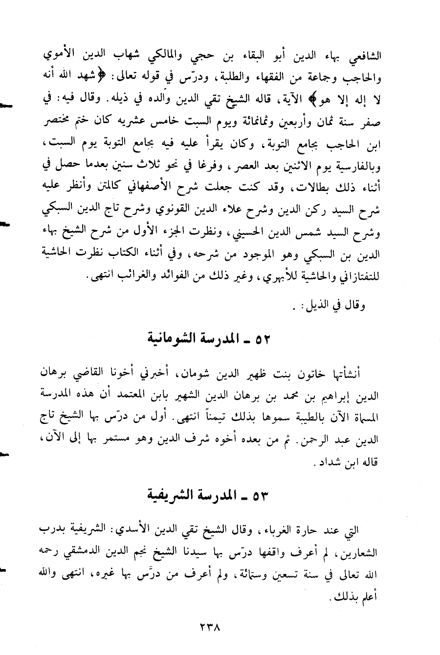 الشافعي بهاء الدين أبو البقاء بن حجي والمالكي شهاب الدين الأموي والحاجب وجماعة من الفقهاء والطلبة ودرس في قوله تعالى: {شَهِدَ اللَّهُ أَنَّهُ لا إِلَهَ إِلَّا هُوَ} الآية قاله الشيخ تقي الدين والده في ذيله. وقال فيه: في صفر سنة ثمان وأربعين وثمانمائة ويوم السبت خامس عشريه كان ختم مختصر ابن الحاجب بجامع التوبة وكان يقرأ عليه فيه بجامع التوبة يوم السبت وبالفارسية يوم الاثنين بعد العصر وفرغا في نحو ثلاث سنين بعدما حصل في أثناء ذلك بطالات وقد كنت جعلت شرح الأصفهاني كالمتن وأنظر عليه شرح السيد ركن الدين وشرح علاء الدين القونوي وشرح تاج الدين السبكي وشرح السيد شمس الدين الحسيني ونظرت الجزء الأول من شرح الشيخ بهاء الدين بن السبكي وهو الموجود من شرحه وفي أثناء الكتاب نظرت الحاشية للتفتازاني والحاشية للأبهري وغير ذلك من الفوائد والغرائب انتهى.