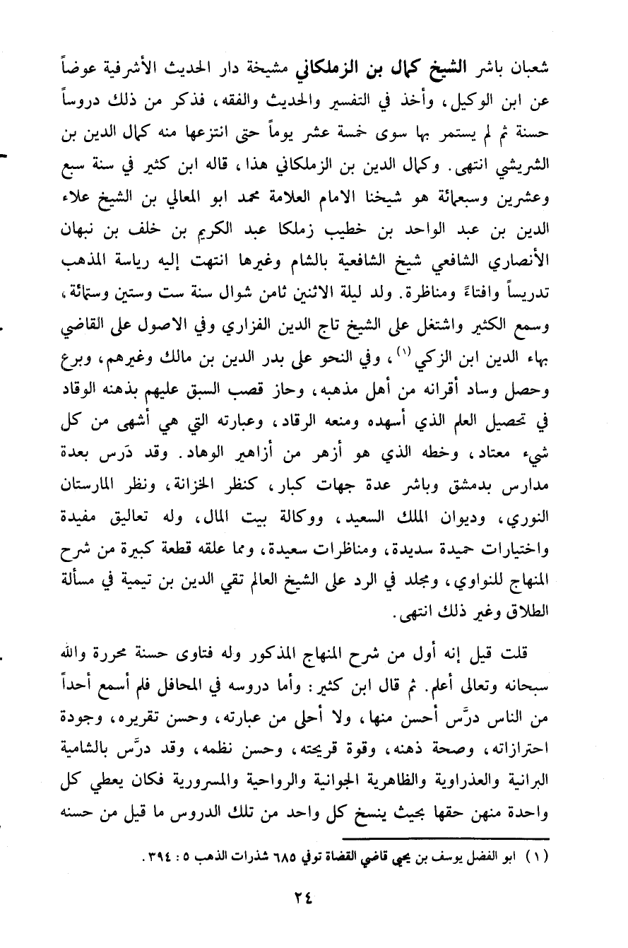 شعبان باشر الشيخ كمال بن الزملكاني مشيخة دار الحديث الاشرفية عوضا عن ابن الوكيل وأخذ في التفسير والحديث والفقه فذكر من ذلك دروسا حسنة ثم لم يستمر بها سوى خمسة عشر يوما حتى أنتزعها منه كمال الدين بن الشريشي انتهى. وكمال الدين بن الزملكاني هذا قاله ابن كثير في سنة سبع وعشرين وسبعمائة هو شيخنا الامام العلامة محمد أبو المعالي بن الشيخ علاء الدين بن عبد الواحد بن خطيب زملكا عبد الكريم بن خلف بن نبهان الانصاري الشافعي شيخ الشافعية بالشام وغيرها انتهت إليه رياسة المذهب تدريسا وافتاء ومناظرة ولد ليلة الاثنين ثامن من شوال سنة ست وستين وستمائة وسمع الكثير واشتغل على الشيخ تاج الدين الفزاري وفي الاصول على القاضي بهاء الدين ابن الزكي1 وفي النحو على بدر الدين بن مالك وغيرهم وبرع وحصل وساد أقرانه من أهل مذهبه وحاز قصب السبق عليهم بذهنه الوقاد في تحصيل العلم الذي أسهده ومنعه الرقاد وعبارته التي هي أشهى من كل شيء معتاد وخطه الذي هو أزهر من أزاهير الوهاد وقد درس بعدة مدارس بدمشق وباشر عدة جهات كبار كنظر الخزانة ونظر المارستان النوري وديوان الملك السعيد ووكالة بيت المال وله تعاليق مفيدة واختيارات حميدة سديدة ومناظرات سعيدة ومما علقه قطعة كبيرة من شرح المنهاج للنواوي ومجلد في الرد على الشيخ العالم تقي الدين بن تيمية في مسألة الطلاق وغير ذلك انتهى.