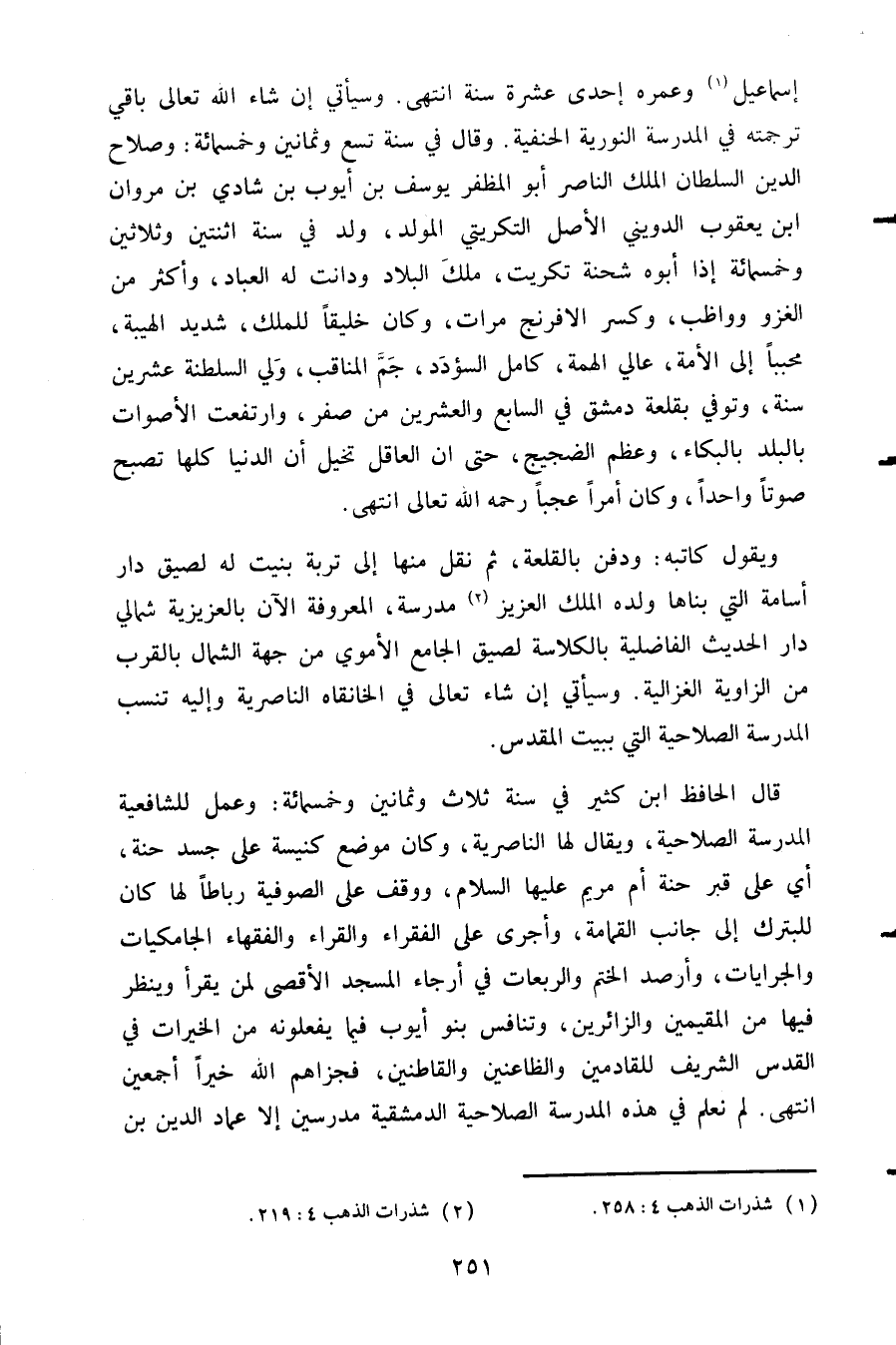 إسماعيل1 وعمره إحدى عشرة سنة انتهى وسيأتي إن شاء الله تعالى باقي ترجمته في المدرسة النورية الحنفية وقال في سنة تسع وثمانين وخمسمائة: وصلاح الدين السلطان الملك الناصر أبو المظفر يوسف بن أيوب بن شادي بن مروان ابن يعقوب الدويني الأصل التكريتي المولد ولد في سنة اثنتين وثلاثين وخمسمائة إذا أبوه شحنة تكريت ملك البلاد ودانت له العباد وأكثر من الغزو وواظب وكسر الافرنج مرات وكان خليقا للملك شديد الهيبة محببا إلى الأمة عالي الهمة كامل السؤدد جم المناقب ولي السلطنة عشرين سنة وتوفي بقلعة دمشق في السابع والعشرين من صفر وارتفعت الاصوات بالبلد بالبكاء وعظم الضجيج حتى أن العاقل تخيل أن الدنيا كلها تصبح صوتا واحدا وكان امرا عجبا رحمه الله تعالى انتهى.