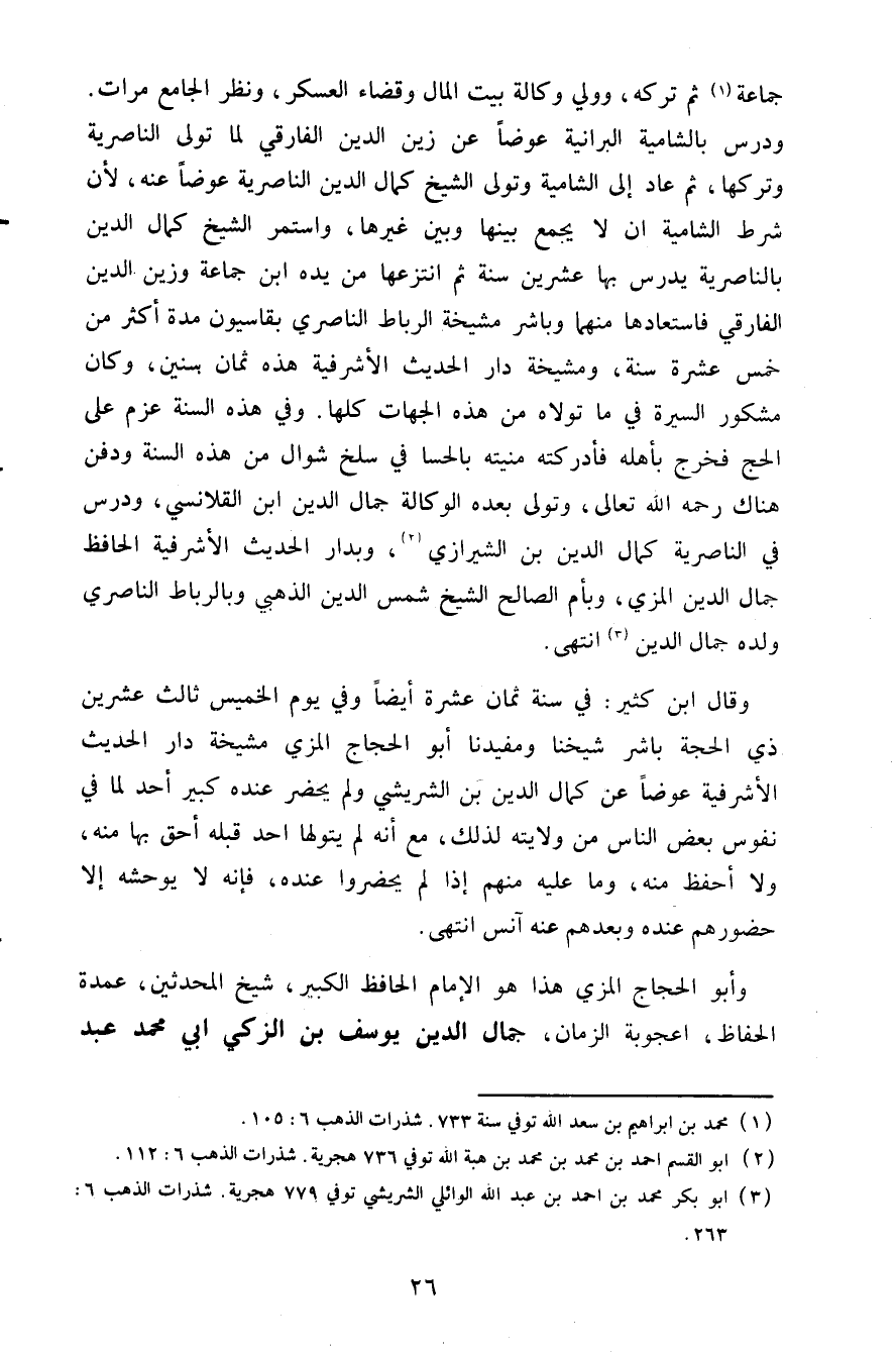جماعة1 ثم تركه وولي وكالة بيت المال وقضاء العسكر ونظر الجامع مرات ودرس بالشامية البرانية عوضا عن زين الدين الفارقي لما تولى الناصرية وتركها ثم عاد إلى الشامية وتولى الشيخ كمال الدين الناصرية عوضا عنه لأن شرط الشامية أن لا يجمع بينها وبين غيرها وأستمر الشيخ كمال الدين بالناصرية يدرس بها عشرين سنة ثم أنتزعها من يده أبن جماعة وزين الدين الفارقي فاستعادها منهما وباشر مشيخة الرباط الناصري بقاسيون مدة أكثر من خمس عشرة سنة ومشيخة دار الحديث الأشرفية هذه ثمان سنين وكان مشكور السيرة في ما تولاه من هذه الجهات كلها وفي هذه السنة عزم على الحج فخرج بأهله فأدركته منيته بالحسا في سلخ شوال من هذه السنة ودفن هناك رحمه الله تعالى وتولى بعده الوكالة جمال الدين أبن القلانسي ودرس في الناصرية كمال الدين بن الشيرازي2 وبدار الحديث الأشرفية الحافظ جمال الدين المزي وبأم الصالح الشيخ شمس الدين الذهبي وبالرباط الناصري ولده جمال الدين3 انتهى.