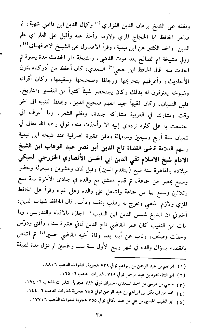 وتفقه على الشيخ برهان الدين الفزاري1 وكمال الدين ابن قاضي شهبة ثم صاهر الحافظ أبا الحجاج المزي ولازمه وأخذ عنه وأقبل على العلم أي علم الدين وأخذ الكثير عن ابن تيمية وقرأ الأصول على الشيخ الأصفهاني2 وولي مشيخة أم الصالح بعد موت الذهبي ومشيخة دار الحديث مدة يسيرة ثم اخدت منه قال الحافظ ابن حجي3 السعدي كان أحفظ من أدركناه لمتون الأحاديث وأعرفهم بتخريجها ورجالها وصحيحها وسقيمها وكان أقرانه وشيوخه يعترفون له بذلك وكان يستحضر شيئا كثيرا من التفسير والتاريخ قليل النسيان وكان فقيها جيد الفهم صحيح الدين ويحفظ التنبيه إلى آخر وقت ويشارك في العربية مشاركة جيدة ونظم الشعر وما أعرف أني اجتمعت به على كثرة ترددي إليه إلا وأخذت منه توفي رحمة الله تعالى في شعبان سنة أربع وسبعين وسبعمائة ودفن بمقبرة الصوفية عند شيخه ابن تيمية ومنهم العلامة قاضي القضاة تاج الدين أبو نصر عبد الوهاب ابن الشيخ الإمام شيخ الإسلام تقي الدين أبي الحسن الأنصاري الخزرجي السبكي ميلاده بالقاهرة سنة سبع بتقديم السين وقيل ثمان وعشرين وسبعمائة وحضر وسمع بمصر من جماعة ثم قدم دمشق مع والده في جمادى الآخرة سنة تسع وثلاثين وسمع بها من جماعة واشتغل على والده وعلى غيره وقرأ على الحافظ المزي ولازم الذهبي وتخرج به وطلب بنفسه ودأب قال الحافظ شهاب الدين: أخبرني أن الشيخ شمس الدين ابن النقيب أجازه بالإفتاء والتدريس ولما مات ابن النقيب4 كان عمر القاضي تاج الدين ثماني عشرة سنة وأفتى ودرس وحدث وصنف وناب عن أبيه بعد وفاة أخيه القاضي حسين5 ثم اشتغل بالقضاء بسؤال والده في شهر ربيع الأول سنة ست وخمسين ثم عزل مدة لطيفة