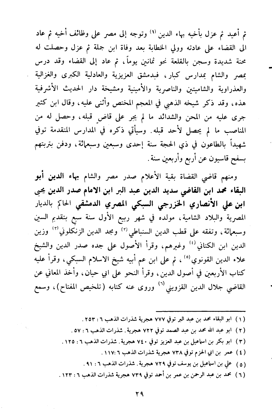 ومنهم قاضي القضاة بقية الأعلام صدر مصر والشام بهاء الدين أبو البقاء محمد ابن القاضي سديد الدين عبد البر ابن الإمام صدر الدين يحيى ابن علي الأنصاري الخزرجي السبكي المصري الدمشقي الحاكم بالديار المصرية والبلاد الشامية مولده في شهر ربيع الأول سنة سبع بتقديم السين وسبعمائة وتفقه على قطب الدين السنباطي2 ومجد الدين الزنكلوني3 وزين الدين ابن الكتاني4 وغيرهم وقرأ الأصول على جده صدر الدين والشيخ علاء الدين القونوي5 ثم على ابن عم أبيه شيخ الإسلام السبكي وقرأ عليه كتاب الأربعين في أصول الدين وقرأ النحو على أبي حيان وأخذ المعاني عن القاضي جلال الدين القزويني6 وروى عنه كتابه تلخيص المفتاح وسمع