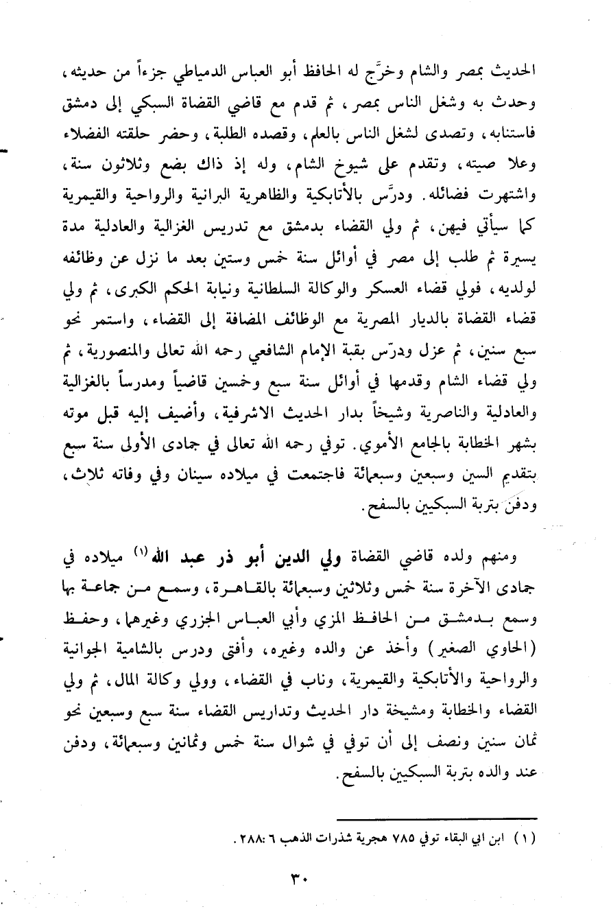 ومنهم ولده قاضي القضاة ولي الدين أبو ذر عبد الله 1 ميلاده في جمادى الآخرة سنة خمس وثلاثين وسبعمائة بالقاهرة وسمع من جماعة بها وسمع بدمشق من الحافظ المزي وأبي العباس الجزري وغيرهما وحفظ الحاوي الصغير وأخذ عن والده وغيره وأفتى ودرس بالشامية الجوانية والرواحية والأتابكية والقيمرية وناب قي القضاء وولي وكالة المال ثم ولي القضاء والخطابة ومشيخة دار الحديث وتداريس القضاء سنة سبع وسبعين نحو ثمان سنين ونصف إلى أن توفي في شوال سنة خمس وثمانين وسبعمائة ودفن عند والده بتربة السبكيين بالسفح.