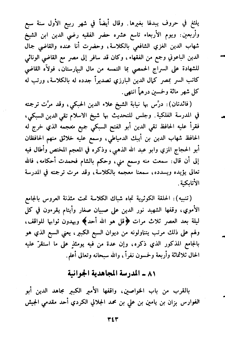 فائدتان: درس بها نيابة الشيخ علاء الدين الحبكي وقد مرت ترجمته في المدرسة الفلكية وجلس للتحديث بها شيخ الإسلام تقي الدين السبكي فقرا عليه الحافظ تقي الدين أبو الفتح السبكي جميع معجمه الذي خرج له الحافظ شهاب الدين بن أيبك الدمياطي وسمع عليه خلائق منهم الحافظان أبو الحجاج المزي وأبو عبد الله الذهبي وذكره في المعجم المختص وأطال فيه إلى أن قال: سمعت منه وسمع مني وحكم بالشام حمدت أحكامه فالله تعالى يؤيده ويسدده سمعنا معجمه بالكلاسة وقد مرت ترجمته في المدرسة الأتابكية.