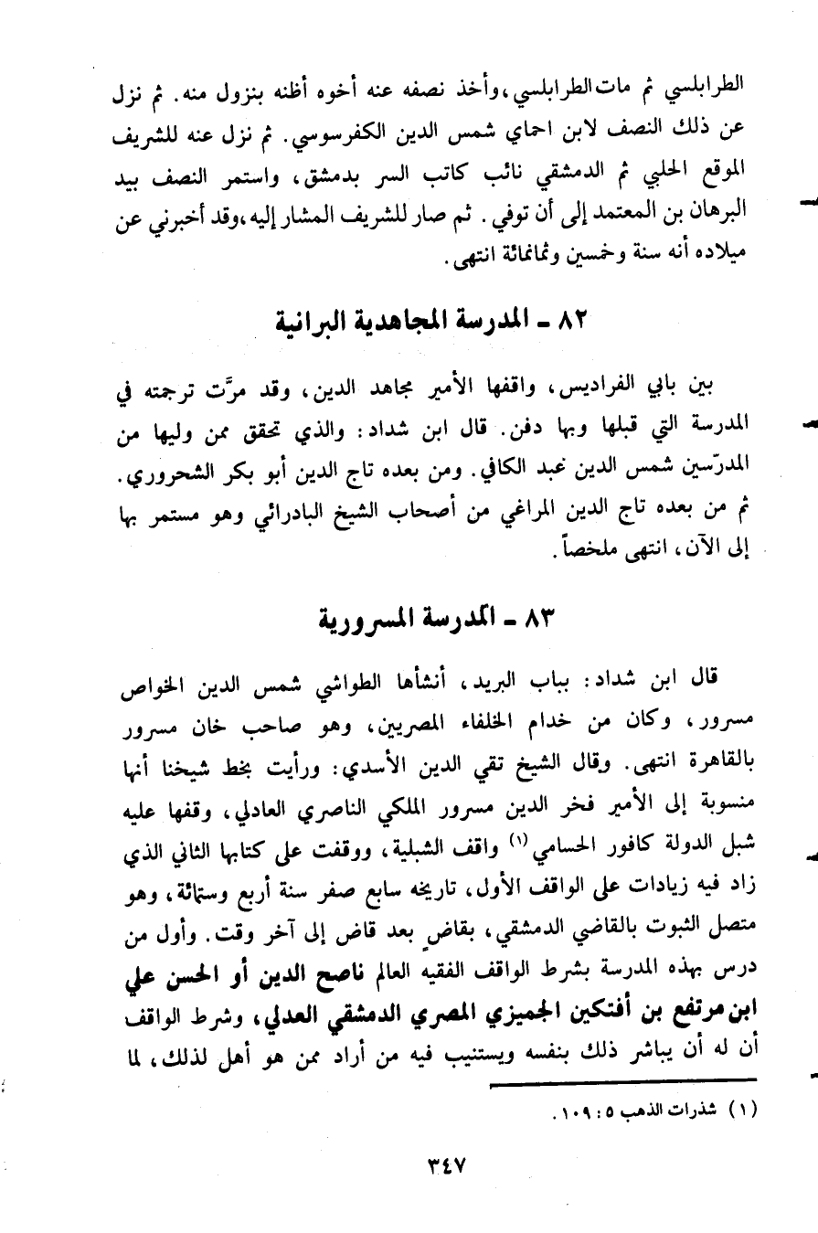 الطرابلسي ثم مات الطرابلسي وأخذ نصفه عنه أخوه أظنه بنزول منه ثم نزل عن ذلك النصف لابن احماي شمس الدين الكفرسوسي ثم نزلعنه للشريف الموقع الحلبي ثم الدمشقي نائب كاتب السر بدمشق واستمر النصف بيد البرهان بن المعتمد إلى أن توفي. ثم صار للشريف المشار إليه وقد أخبرني عن ميلاده أنه سنة خمسين وثمانمائة انتهى.
