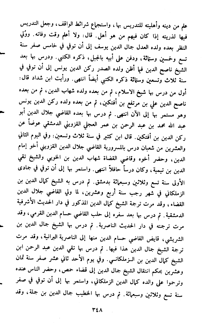 علم من دينه وأهليته للتدريس بها واستجماع شرائط الواقف وجعل التدريس فيها لذريته إذا كان فيهم من هو أهل قال ولا أعلم وقت وفاته وولي النظر بعده ولده العدل جما الدين يوسف إلى أن توفي في خامس صفر سنة تسع وخمسين وستمائة ودفن على أبيه بالجبل ذكره الكتبي ودرس بها بعد الشيخ ناصح الدين فيما أظن ولده الصدر ركن الدين يونس إلى أن توفي في سنة ثلاثة وتسعين وستمائة ذكره الكتبي أيضا انتهى ورأيت ابن شداد قال أول من درس بها شيخ الإسلام ثم من بعده ولده شهاب الدين ثم من بعده ناصح الديت علي بن مرتفع بن أفتكين ثم من بعده ولده ركن الدين يونس وهو مستمر بها إلى الآن انتهى ثم درس بها بعده القاضي جلال الدين أبو عبد الله محمد بن عبد الرحمن بن عمر العجلي القزويني الدمشقي عوضا عن ركن الدين بن أفتكين قال ابن كثير في سنة ثلاث وتسعين وفي اليوم الثاني والعشرين من شعبان درس بالمسرورية القاضي جلالالدين القزويني أخو إمام الدين وحضر أخوه وقاضي القضاة شهاب الدين بن الخويي والشيخ تقي الدين بن تيمية وكان درسا حافلا انتهى واستمر بها إلى أن توفي في جمادى الأولى سنة تسع وثلاثين وسبعمائة بدمشق ثم درس به الشيخ كمال الدين بن الزملكاني في شهر رجب سنة أربع وعشرين لما ولي القاضي جلال الدين القضاء وقد مرت ترجمة الشيخ كمال الدين المذكور في دار الحديث الأشرفية الدمشقية ثم درس بها بعد سفره إلى حلب القاضي حسام الدين القرمي وقد مرت ترجمته في دار الحديث الناصرية ثم درس بها الشيخ جمال الدين بن الشريشي قايض القاضي حسام الدين منها إلى الناصرية البرانية وقد مرت ترجمة الشيخ جمال الدين هذا فيها ثم درس بها تقي الدين عبد الرحمت ابن الشيخ كمال الدين بن الزملكاني وفي يوم الأحد ثاني عشر صفر سنة ثمان وعشرين بحكم انتقال الشيخ جمال الدين إلى قضاء حمص وحضر الناس عنده وترحموا على والده كمال الدين الزملكاني واستمر بها إلى أن توفي في صفر سنة تسع وثلاثين وسبعمائة ثم درس بها الخطيب جمال الدين بن جملة وقد