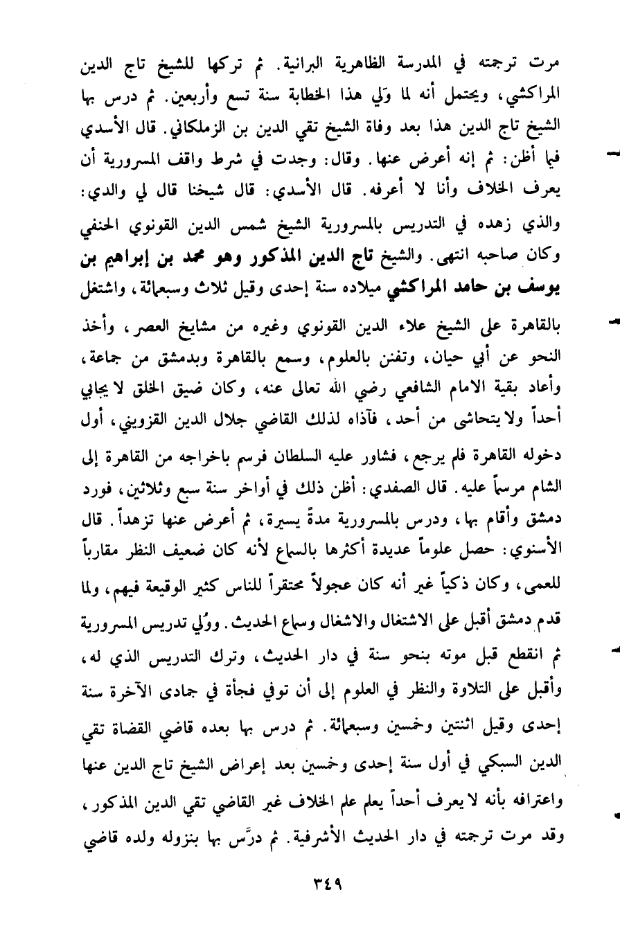 مرت ترجمته في المدرسة الظاهرية البرانية ثم تركخا للشيخ تاج الدين المراكشي ويحتمل أنه لما ولي هذا الخطابة سنة تسع وأربعين ثم درس بها الشيخ تاج الدين هذا بعد وفاة الشيخ تقي الدين بن الزملكاني قال الأسدي فيما أظن ثم غنه أعرض عنها وقال وجدت في شرطك واقف المسرورية أن يعرف الخلاف وأنا لا أعرفه قال الأسدي قال شيخنا قال لي والدي والذي زهده في التدريس بالمسرورية الشيخ شمس الدين القونوي الحنفي وكان صاحبه انتهى والشيخ تاج الدين المذكور وهو محمد بن إبراهيم بن يوسف بن حامد المراكشي ميلادخ سنة إحدى وقيل ثلاث وسبعمائة واشتغل بالقاهرة على الشيخ علاء الدين القونوي وغيره من مشايخ العصر وأخذ النحو عن أبي حيان وتفنن بالعلوم وسمع بالقاهرة وبدمشق من جماعة وأعاد بقية الإمام الشافعي رضي الله تعالى عنه وكان ضيق الخلق لا يجابي أحدا ولا يتحاشى من أحد فآذاه لذلك القاضي جلال الدين القزويني أول دخول القاهرة فلم يرجع فشاور عليه السلطان فرسم بإخراجه من القاهرة الى الشام مرسما عليه قال الصفدي أظن ذلك في اواخر سنة سبع وثلاثين فورد دمشق وأقام بها ودرس بالمسرورية مدة يسيرة ثم أعرض عنها تزهدا قال الأسنوي حصل علوما عديدة أكثرها بالسماع لأنه كان ضعيف النظر مقاربا للعمى وكان ذكيا غير أنه كان عجولا محتقرا للناس كثير الوقيعة فيهم ولما قدم دمشق أقبل على الاشتغال والاشغال وسماع الحديث وولي تدريس المسرورية ثم انقطع قبل موته بنحو سنة في دار الحديث وترك التدريس الذي له واقبل على التلاوة والنظر في العلوم إلى أن توفي فجأة في جمادى الآخرة سنة إخدى وقيل اثنتين وخمسين وسبعمائة ثم درس بها بعده قاضي القضاة تقي الدين السبكي في أول سنة إحدى وخمسين بعد إعراض الشيخ تاج الدين عنها واعترافه بأنه لا يعرف أحدا يعلم علم الخلاف غير القاضي تقي الدين المذكور وقد مرت ترجمته في دار الحديث الأشرفية ثم درس بها بنزوله ولده قاضي