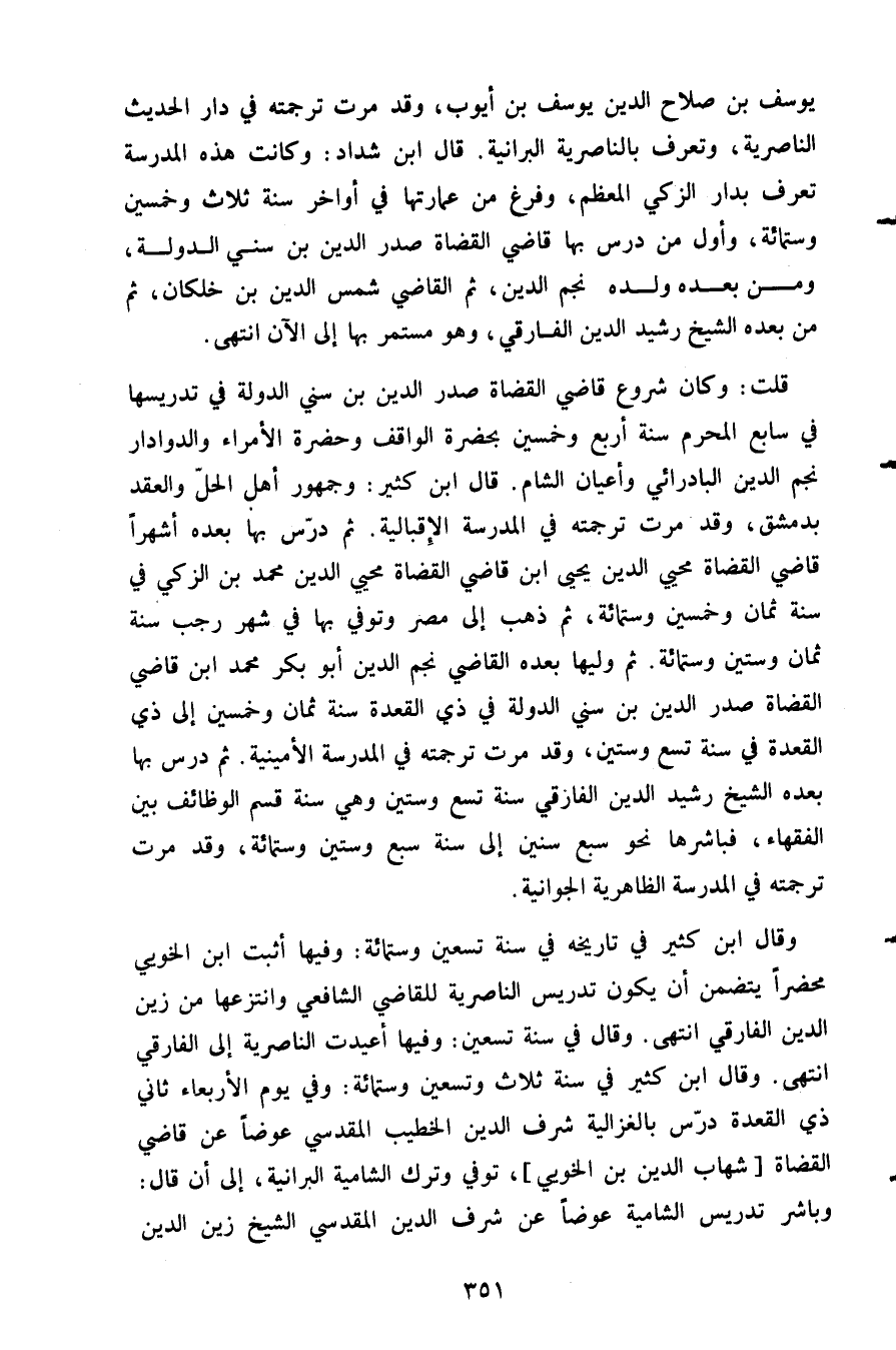وقال ابن كثير في تاريخه في سنة تسعين وستمائة وفيها أثبت ابن الخويي محضرا يتضمن أن يكون تدريس الناصرية للقاضي الشافعي وانتزعها من زيد الدين الفارقي انتهى وقال في سنة تسعين وفيه أعيدت الناصرية إلى الفارقي انتهى وقال ابن كثير في سنة ثلاث وتسعين وستمائة وفي يوم الأربعاء ثاني ذي القعدة درس بالغزالية شرف الدين الخطيب المقدسي عوضا عن قاضي القضاة شهاب الدين بن الخويي توفي وترك الشامية البرانية إلى أن قال وباشر تدريس الشامية عوضا عن شرف الدين المقدسي الشيخ زين الدين
