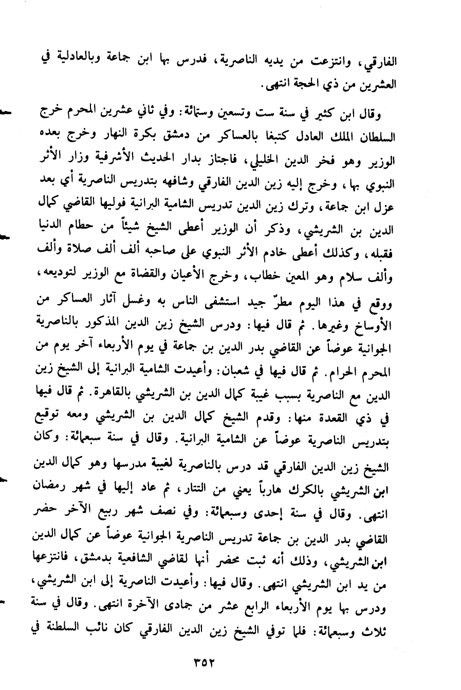 وقال ابن كثير في سنة ست وتسعين وستمائة وفي ثاني عشرين المحرم خرج السلطان الملك العاجل كتبغا بالعساكر من دمشق بكرة النهار وخرج بعده الوزير وهو فخر الدين الخليلي فاجتاز بدار الحديث الأشرفية وزار الأثر النبوي بها وخرج إليها زين الدين الفارقي وشافهه بتدريس النصارية أي بعد عزل ابن جماعة وترك زين الدين تدريس الشامية البرانية فوليها القاضي كمال الدين بن الشريشي وذكر أن الوزير أعطى الشيخ شيئا من حطام الدنيا فقبله وكذلك أعطى خادم الأثر النبوي على صاحبخ ألف ألف صلاة وألف وألف سلام وهو المعين خطاب وخرج الأعيان والقضاة مع الوزير لتوديعه ووقع في هذا اليوم مطر جيد استشفى الناس به وغسل آثار العساكر من الأوساخ وغيرها ثم قال فيها ودرس الشيخ زين الدين المذكور بالناصرية الجوانية عوضا عن القاضي بدر الدين بن جماعة في يوم الأربعاء آخر يوم من المحرم الحرام ثم قال فيها في شعبان وأعيدت الشامية البرانية إلى الشيخ زين الدين مع النصارية بسبب غيبة كمال الدين بن الشريشي بالقاهرة ثم قال فيها في ذي القعدة منها وقدم الشيخ كمال الدين بن الشريشي ومعه توقيع بتدريس الناصرية عوضا عن الشامية البرانية وقال في سنة سبعمائة وكان الشيخ زين الدين الفارقي قد درس بالناصرية لغيبة مدرسها وهو كمال الدين ابن الشريشي بالكرك هاربا يعني من التتار قم عاد إليها في شهر رمضان انتهى وقال في سنة إحدى وسبعمائة وفي نصف شهر ربيع الآخر حضر القاضي بدر الدين بن جماعة تدريس الناصرية الجوانية عوضا عن كمال الدين ابن الشريشي وذلك أنه ثبت محضر أنها لقاضي الشافعية بدمشق فانتزعها من يد ابن الشريشي انتهى وقال فيها وأعيدت الناصرية إلى أن الشريشي ودرس بها يوم الأربعاء الرابع عشر من جمادى الآخرة انتهى وقال في سنة ثلاث وسبعمائة فلما توفي الشيخ زين الدين الفارقي كان نائب السلطنة في