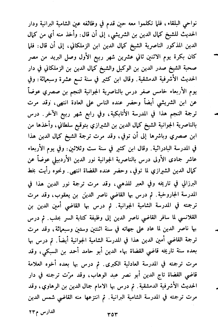 نواحي البلقاء فلما تكلموا معه حين قدم فيه وظائفه عين الشامية البرانية ودار الحديث للشيخ كمال الدين بن الشريشي إلى أن قال وأخذ منه أي من كمال الدين المذكور الناصرية الشيخ كمال الدين ابن الزملكاني إلى أن قال فلما كان بكرة يوم الإثنين ثاني عشرين شهر ربيع الأول وصل البريد من مصر صحبة الشيخ صدر الدين بن الوكيل والشيخ كمال الدين بن الزملكاني في دار الحديث الأشرفية الدمشقية وقال ابن كثير في سنة تسع عشرة وسبعمائة وفي يوم الأربعاء خامس صفر درس بالناصرية الجوانية النجم بن صصري عوضا عن ابن الشريشي أيضا وحضر عنده الناس على العادة انتهى وقد مرت ترجمة النجم هذا في المدرسة الأتابكية وفي رابع شهر ربيع الآخر درس بالناصرية الجوانية الشيخ كمال الدين بن الشيرازي بتوقيع سلطاني واخذها من ابن صصري وباشرها إلى أن توفي وقد مرت ترجمة الشيخ كمال الدين هذا في المدرسة البادرائية وقال ابن كثير في سنة ست وثلاثين وفي يوم الأربعاء عاشر جمادى الأولى درس بالناصرية الجوانية نور الدين الأردبيلي عوضا عن كمال الدين الشيرازي لما توفي وحضر عنده القضاة انتهى ونحو رأيت بخط البرزالي في تاريخه وفي العبر للذهبي وقد مرت ترجمة نور الدين هذا في المدرسة الجاروخية ثم درس بها القاضي ناص الدين بن يعقوب وقد مرت ترجمته في المدرسة الشامية الجوانية ثم درس بها القاضي أيمن الدين بن القلانسي لما سافر القاضي ناصر الدين إلى وظيفة كتابة السر بحلب ثم درس بها ناصر الدين لما عاد على جهاته في سنة اثنتين وستين وسبعمائة وقد مرت ترجمة القاضي أمين الدين هذا في المدرسة الشامية الجوانية أيضا ثم درس بها بعده سنة تاريخه قاضي القضاة بهاء الدين أبو حامد أحمد بن السبكي وقد مرت ترجمته في المدرسة العادلية الكبرى ثم درس بها بعده أخوه العلامة قاضي القضاة تاج الدين أبو نصر عبد الوهاب وقد مرت ترجمته في دار الحديث الأشرفية الدمشقية ثم درس بها الإمام جمال الدين بن الرهاوي وقد مرت ترجمته في المدرسة الشامية البرانية ثم انتزعها منه القاضي شمس الدين