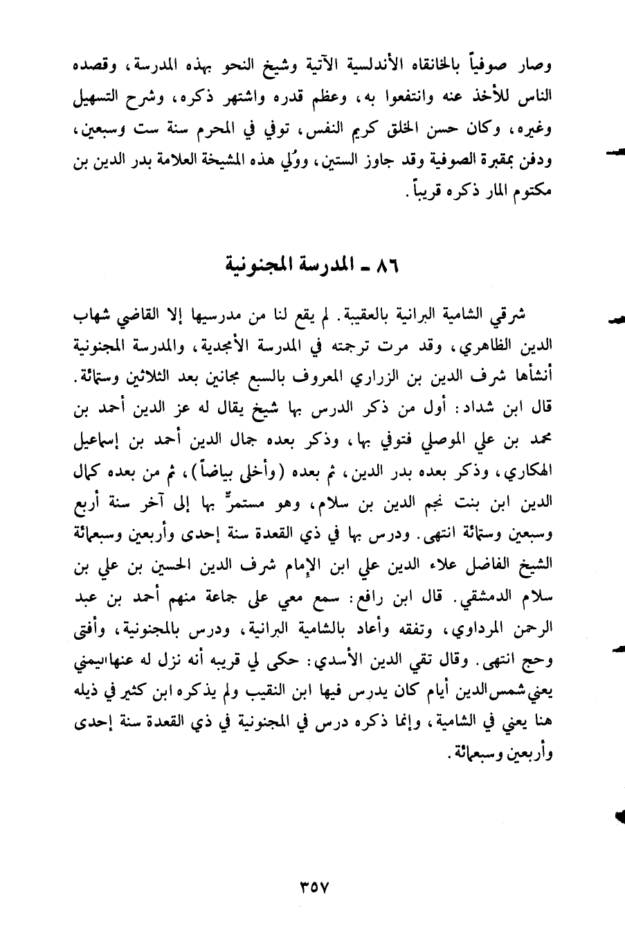 شرقي الشامية البرانية بالعقيبة. لم يقع لنا من مدرسيها إلا القاضي شهاب الدين الظاهري وقد مرت ترجمته في المدرسة الأمجدية والمدرسة المجنونية أنشأها شرف الدين بن الزراري المعروف بالسبع مجانين بعد الثلاثين وستمائة. قال ابن شداد. أول من ذكر الدرس بها شيخ يقال له عز الدين أحمد بن محمد بن علي الموصلي فتوفي يها وذكر بعده جمال الدين أحمد بن إسماعيل الهكاري وذكر بعده بدر الدين ثم بعده وأهلى بياضا ثم من بعده كمال الدين ابن بنت نجم الدين بن سلام وهو مستمر ها إلى آخر سنة أربع وسبعين وستمائة انتهى. ودرس بها في ذي القعدة سنة إحدى وأربعين وسبعمائة الشيخ الفاضل علاء الدين علي أب الإمام شرف الدين الحسين بن علي بن سلام الدمشقي. قال ابن رافع: سمع معي على جماعة منهم أحمد بن عبد الرحمن المرداوي وتفقه وأعاد بالشامية البرانية ودرس بالمجنونية وأفنى وحج انتهى. وقال تقي الدين الأسدي: حكى لي قريبه أنه نزل له عنها اليمني يعني شمس الدين أيام كان يدرس فيها ابن النقيب ولم يذكره ابن كثير في ذيله هنا يعني في الشامية وإنما ذكره درس في المجنونية في ذي القعدة سنة احدة وأربعين وسبعمائة.