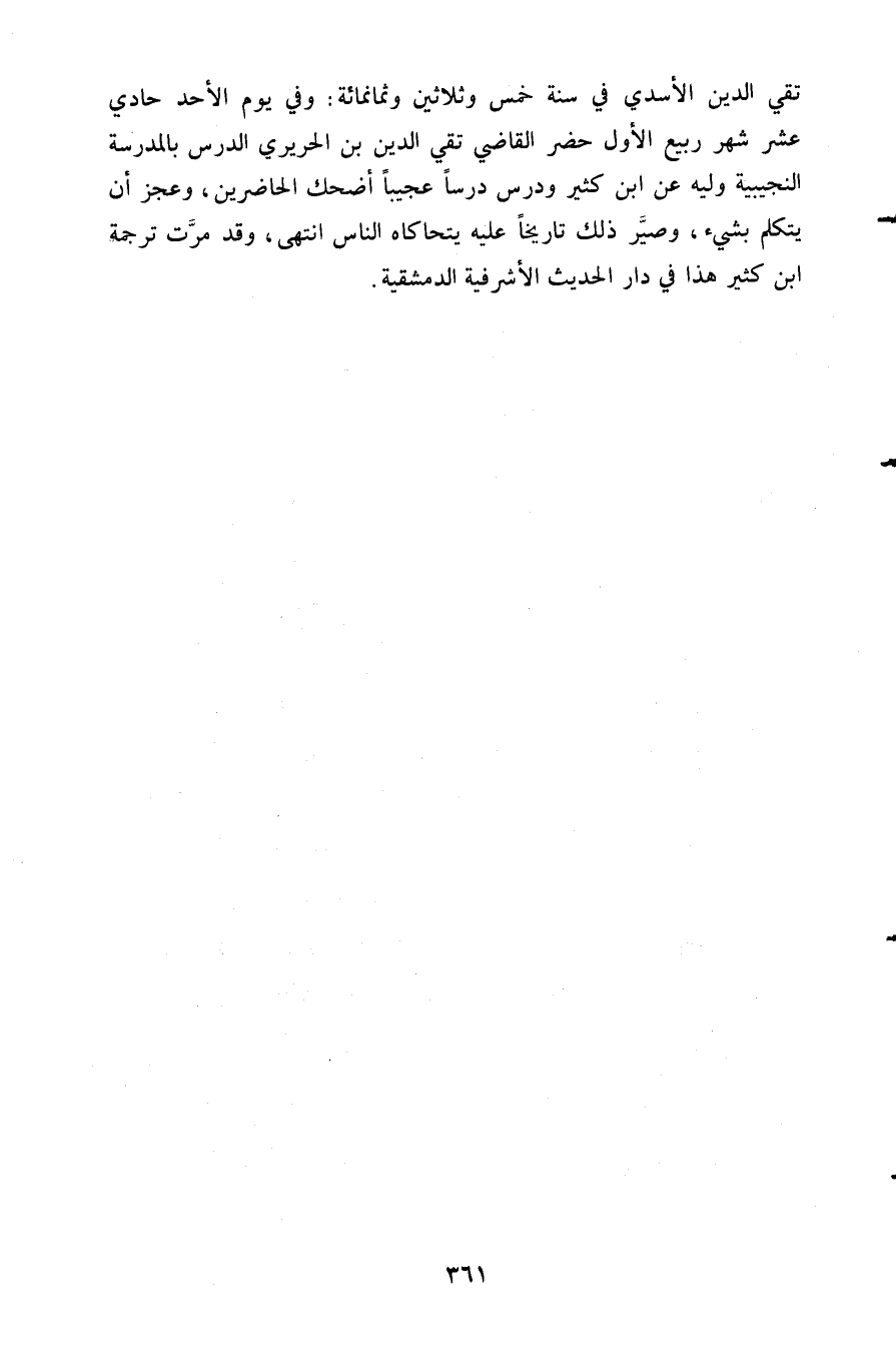 تقي الدين الأسدي في سنة خمس وثلاثين وثمانمائة وفي يوم الأحد حادي عشر شهر ربيع الأول حضر القاضي تقي الدين بن الحريري الدرس بالمدرسة النجيبية وليه عن ابن كثير ودرس درسا عجيبا أضحك الحاضرين وعجز أن يتكلم بشيء وصير ذلك تاريخا عليه يتحاكاه الناس انتهى. وقد مرت ترجمة ابن كثير هذا في دار الحديث الأشرفية الدمشقية.