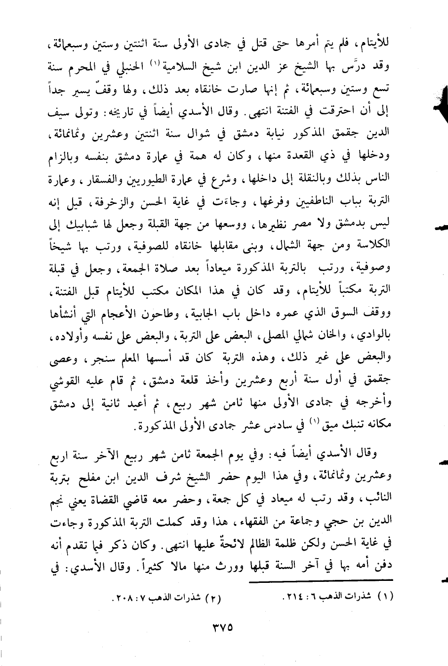 للأيتام فلم يتم أمرها حتى قتل في جمادى الأولى سنة اثنتين وستين وسبعمائة وقد درس بها الشيخ عز الدين ابن شيخ السلامية الحنبلي في المحرم سنة تسع وستين وسبعمائة ثم إنها صارت خانقاه بعد ذلك ولها وقف يسي جدا إلى ان احترقت في الفتنة انتهى قال الأسدي أيضا في تاريخه وتولى سيف الدين جقمق المذكور نيابة دمشق في شوال سنة اثنتبن وعشرين وثمنمائة ودخلها في ذي القعدة منهما وكان له همة في عمارة دمشق بنفسه وبالزام الناس بذلك وبالنقلة إلى داخلها وشرع في عمارة الطيوريين والفسقار وعمارة التربة بباب الناطفييين وفرغها وجاءت في غاية الحسن والزخرفة وقيل انه ليس بدمشق ولامصر نظيرها ووسعها من جهة القبلة وجعل لها شبابيك إلى الكسة ومن جهة الشمال نو بني مقابلة خانقاه للصوفية ورتب بها شيخا وصوفيه ورتب بالتربة المذكورة ميعادا بعد صلاة الجمعة وجعل في قبلة التربة مكتبا للأيتام وقد كان في هذا المكان مكتب للأيتام قبل الفتنة ووقف السوق الذي عمره داخل باب الجابية وطاحون الأعجام التي أنشأها بالوادي والخان شمالي المصلي والبعض على التربة والبعض على نفسه وأولاده والبعض على غير ذلك وهذه التربة كان قد اسسها المعلم سنجر وعصى جقمق في أول سنة أربع وعشرين وأخذ قلعة دمشق ثم قام عليه القوشي وأخره في جمادى الأولى منها ثامن شهر ربيع ثم أعيد ثانية إلى دمش مكانه تنبك ميق في سادس جماي الأولى المذكورة