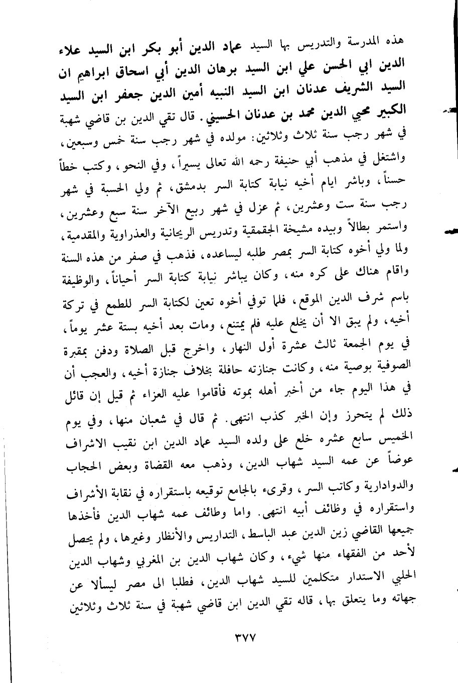 هذه المدرسة والتدريس بها السيد عمادالدين أبو بكر ابن السيد علاء الدين أبي الحسن علي ابن السيد برهان الدين أبي إسحاق إبراهيم أن السيد الشريف عندنان ابن السيد النبيه أمين الدين جعفر ابن السيد الكبير محيي الدين محمد بن عدنان الحسيني قال تقي الدين بن قاضي شهبة في شهر رجب سنة ثلاث وثلاثين مولده في شهر رجب سنة خمس وسبعين واشتغل في مذهب أبي حنيفة رحمه الله تعالى يسيرا وفي النحو وكتب خطا حسنا وباشر أيام أخيه نيابة كتابة السر دمشق ثم ولي الحسبة في شهر رجب سنة ست وعشرين ثم عزل في شهر ربيع الآخر سنة سبع وعشرين واستمر بطالا وبيده مشيخة الجقمقية وتدريس الريحانية والعذراوية والمقدمية ولما ولي أخوه كتابة السر بمصر طلبه ليساعده فذهب في صفر من هذه السنة وأقام هناك على كره منه وكان يباشر نيابة كتابة السر أحيانا والوظيفة باسم شرف الدين الموقع فلما توفي أخوه تعين لكتابة السر للطمع في تركة أخيه ولم يبق إلا أن يخلع عليه فلم يمتنع ومات بعد أخيه بستة عش يوما في يوم الجمعة ثالث عشرة أول النهار وأخرج قبل الصلاة ودفن بمقبرة الصوفية بوصية منه وكانت جنازته حافلة بخلاف جنازة أخيه والعجب أن في هذا اليوم جاء من أخخبر أهله بموته فأقاموا عليه العزاء ثم قيل إن قائل ذك لم يتحرز وإن الخبر كذب انتهى ثم قال في شعان منها وفي يوم الخميس سابع عشرة خلع على ولده السيد عماد الدين ابن نثيب الأشراف عوضا عن عمه السيد شهاب الدين وذهب معه القضاة وبعض الحجاب والدوادارية وكاتب السر وقرئ بالجامع توقيعه باستقراره في نقابة الأشراف واستقراره في وظائف أبيه انتهى وأما وظائف عمه شهاب الدين فأخذها جميعها القاضي زين الدين عبد الباسط التداريس والأنظار وغيرها ولم يحصل لأحد من الفقهاء منها شيء وكان شهاب الدين بن المغربي وشهاب الدين الحلبي الاستدار متكلمين للسيد شهاب الدين فطلبا إلى مصر ليسألا عن جهاته وما يتعلق بها قاله تقي الدين ابن قاضي شهبة في سنة ثلاث وثلاثين
