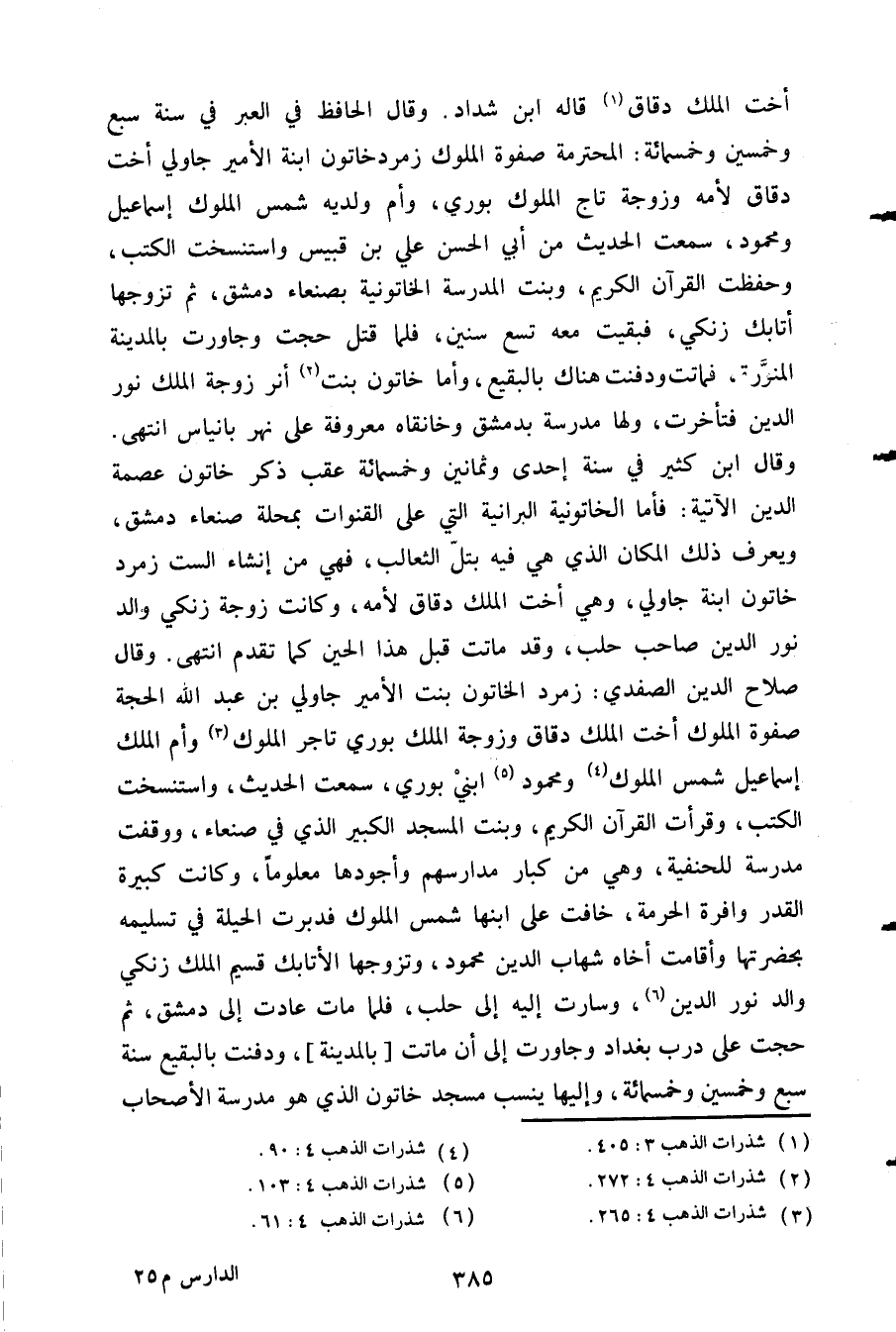 أخت الملك دقاق1 قاله ابن شداد: وقال الحافظ في العبر في سنة سبع وخمسين وخمسمائة: المحترمة صفوة الملوك زمردخاتون ابنة الأمير جاولي أخت دقاق لأمه وزوجة تاج الملوك بوري وأم ولديه شمس الملوك إسماعيل ومحمود سمعت الحديث من أبي الحسن علي بن قبيس واستنسخت الكتب وحفظ القرآن الكرين وبنت المدرسة الخاتونية بصنعاء دمشق ثم تزوجها أتابك زنكي فبقيت معه تسع سنين فلما قتل حجت وجاورت بالمدينة المنورة فماتت ودفنت هناك بالبقيع وأما خاتون بنت2 أنر زوجة الملك نور الدين فتأخرت ولها مدرسة بدمشق وخانقاه معروفة على نهر بانياس انتهى. وقال ابن كثير في سنة إحدى وثمانين وخمسمائة عثب ذكر خاتون عصمة الدين الآتية: فأما الخاتونية البرانية التي على القنوات بمحلة صنعاء دمشق ويعرف ذلك المكا الذي هي فيه بتل الثعالب فهي من إنشاء الست زمرد خاتون ابنة جاولي وهي أخت الملك دقاق لأمه وكانت زوجة زنكي والد نور الدين صاحب حلب وقد ماتت قبل هذا الحين كما تقدم انتهى. وقال صلاح الدين الصفدي: زمرد الخاتون بنت الأمير جاولي بن عبد الله الحجة صفوة الملوك أخت الملك دقاق وزوجة الملك بوري تاجر الملوك3 وأم الملك إسماعيل شمس الملوك4 ومحمود5 ابني بوري سمعت الحديث واستنسخت الكتب وقرأت القرآن الكريم وبنت المسجد الكبير الذي في صنعاء ووقفت مدرسة للحنفية وهي من كبار مدارسهم وأجودها معلوما وكانت كبيرة القدر وافرة الحرمة خافت على ابنها شمس الملوك الأتابك فدبرت الحيلة في تسليمه بحضرتها وأقامت أخاه شهاب الدين محمود وتزوجها الأتابك قسيم الملك زنكي والد نور الدين6 وسارت إليه إلى حلب فلما مات عادت إلى دمشق ثم حجت على درب بغداد وجاورت إلى أن ماتت [بالمدينة] ودفنت بالبقيع سنة سبع وخمسين وخمسمائة واليها ينسب مسجد خاتون الذي هو مدرسة الأصحاب
