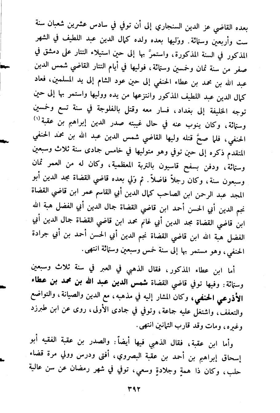 أما ابن عطاء المذكور فقال الذهبي في العبر في سنة ثلاث وسبعين وستمائة: وفيهاتوفي قاضي القضاة شمس الدين عبد الله بن محمد بن عطاء الأذرعي الحنفي وكان المشار إليه في مذهبه مع الدين والصيانة والتواضع والتعفف واشتغل عليه جماعة وتوفي في جمادى الأولى روى عن ابن طبرزد وغيره ومات وقد قارب الثمانين انتهى.