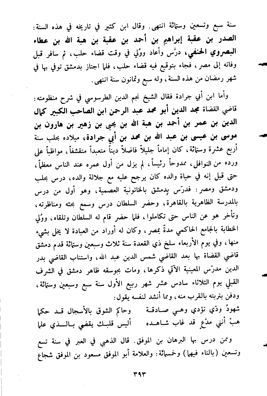 سنة سبع وتسعين وستمائة انتهى. وقال ابن كثير في تاريخه في هذه السنة: الصدر بن عقبة إبراهيم بن أحمد بن عقبة بن هبة الله بن عطاء البصروي الحنفي درس وأعاد وولي في وقت قضاء حلب ثم سافر قبل وفاته إلى مصر فجاء بتوقيع فيه قضاء حلب فلما اجتاز بدمشق توفي بها في شهر رمضان من هذه السنة وله سبع وثمانون سنة انتهى.