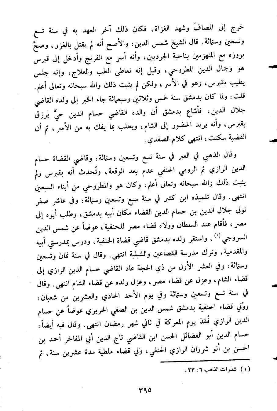 وقال الذهبي في العبر في سنة تسع وتسعين وستمائة: وقاضي القضاو حسام الدين الرازي ثم الرومي الحنفي عدم بعد الوقعة وحدث أنه بقبرس ولم يثبت ذلك والله سبحانه وتعالى أعلم وكان هو المطروحي من أنباء السبعين انتهى. وقال تلميذه ابن كثير في سنة سبع وتسعين وستمائة: وفي عاشر صفر تولى جلال الدين بن حسام الدين القضاء مكان أبيه بدمشق وطلب أبوه إلى مصر فاقم عند السلطان وولاه قضاء مصر للحنفية عوضا عن شمس الدين السروجي1 واستقر ولده يدمشق قاضي قضاة الحنفية ودرس بمدرستي أبيه والمقدمية وترك مدرسة القصاعين والشبلية انتهى. وقال في سنة ثمان وتسعين وستمائة: وفي العشر الأول من ذي الحجة عاد القاضي حسام الدين الرازي إلى قضاء الشام وعزل عن قضاء مصر وعزل ولده عن قضاء الشام انتهى. وقال في سنة تسع وتسعين وستمائة وفي يوم الأحد الحادي والعشرين من شعبان: وولي قضاء الحنفية بدمشق شمس الدين بن الصفي الحريري عوضا عن حسام الدين الرازي فقد يوم المعركة في ثاني شهر رمضان انتهى. وقال فيه أيضا: حسام الدين أبو الفضائل الحسن ابن القاضي تاج الدين أبي المفاخر أحمد بن الحسن بن انو شروان الرازي الحنفي ولي قضاء ملطية مدة عشرين سنة ثم