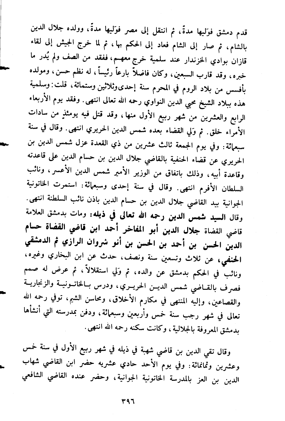 قدم دمشق فوليها مدة ثم انتقل إلى مصر فوليها مدة وولده جلال الدين بالشام ثم صار إلى الشام فعاد إلى الحكم بها ثم لما خرج الجيش إلى لقاء قازان بوادي الخزندار عند سلمية خرج معهم ففقد من الصف ولم يدر ما خبره وقد قارب السبعين وكان فاضلا بارعا رئيسا له نظم حسن ومولده بافسس من بلاد الروم في المحرم سنة إحدى وثلاثين وستمائة قلت وسلمية هذه ببلاد الشيخ محيي الدين النواوي رحمه الله تعالى انتهى. وفقد يوم الأربعاء الرابع والعشرين من شهر ربيع الأول منها وقد قنل فيه يومئذ من سادات الأمراء خلق ثم ولي القضاء بعده شمس الدين الحريري انتهى. وقال في سنة سبعمائة: وفي يوم الجمعة ثالث عشرين من ذي القعدة عزل شمس الدين بن الحريري عن قضاء الحنفية بالقاضي جلال الدين بن حسام الدين على قاعدته وقاعدة أبيه وذلك باتفاق من الوزير الأمير شمس الدين الأعسر ونائب السلطان الأفرم انتهى. وقال في سنة إحدى وسبعمائة: استمرت الخاتونية الجوانية بيد القاضي جلال الدين بن حسام الدين بإذن نائب السلطنة انتهى. وقال السيد شمس الدين رحمه الله تعالى في ذيله وما بدمشق العلامة قاضي القضاة جلال الدين أبو المفاخر أحمد ابن قاضي القضاة حسام الدين الحسن بن أحمد بن الحسن بن أنو شروان الرازي ثم الدمشقي الحنفي عن ثلاث وتسعين سنة ونصف حدث عن ابن البخاري وغيره ونائب في الحكم بدمشق عن والده ثم ولي استقلالا ثم عرض له صمم فصرف بالقاضي شمس الدين الحريري ودرس بالخاتونية والزنجارية والقصاعين واليه المنتهى في مكارم الأخلاق ومحاسن الشيم توفي رحمه الله تعالى في شهر رجب سنة خمس وأربعين وسبعمائة ودفن بمدرسته التي أنشأها بدمشق المعروفة بالجلالية وكانت سكنه رحمه الله انتهى.