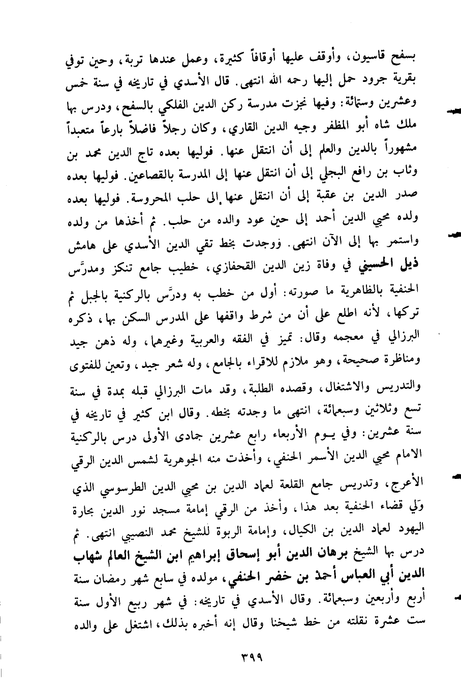 بسفح قاسيون وأوقف عليها أوقافا كثيرة وعمل عندها تربة وحين توفي بقرية جرود حمل إليها رحمه الله انتهى. قال الأسدي في تاريخه في سنة خمس وعشرين وستمائة: وفيها نجزت مدرسة ركن الدين الفلكي بالسفح ودرس بها ملك شاه أبو المظفر وجيه الدين القاري وكان رجلا فاضلا بارعا متعبدا مشهورا بالدين والعلم إلى أن انتقل عنها فوليها بعده تاج الدين محمد بن وثاب بن رافع البجلي إلى أن انتقل عنها إلى المدرسة بالقصاعين فوليها بعده صدر الدين بن عقبة إلى أن انتقل عنها إلى حلب المحروسة فوليها بعده ولده محيي الدين أحمد إلى حين عود والده من حلب ثم اخذها من ولده واستمر بها إلى الآن انتهى. ووجدت بخط تقي الدين الأسدي على هامش ذيل الحسيني في وفاة زين الدين القحفازي خطيب جامع تنكز ومدرس الحنفية بالظاهرية ما صورته أول من خطب به ودرس بالركنية بالجبل ثم تركها لأنه اطلع على أن من شرط واقفها على المدرس السكن بها ذكره البرزالي في معجمه وقال تميز في الفقه والعربية وغيرهما وله ذهن جيد ومناظرة صحيحة وهو ملازم للإقراء بالجامع وله شعر جيد وتعين للفتوى والتدريس والاشتغال وقصده الطلبة وقد مات البرزالي قبله بمدة في سنة تسع وثلاثين وسبعمائة انتهى. ما وجدته بخطه وقال ابن كثير في تاريخه في سنة عشرين: وفي يوم الأربعاء رابع عشرين جمادى الأولى درس بالركنية الإمام محيي الدين الأسمر الحنفي واخذت منه الجوهري لشمس الدين الرقي الأعرج وتدريس حامع القلعة لعماد الدين بن محيي الدين الطرسوسي الذي ولي قضاء الحنفية بعد هذا وخذ من الرقي إمامة مسجد نور الدين بحارة اليهود لعماد الدين بن الكيال وإمامة الربوة للشيخ محمد النصيبي انتهى. ثم درس بها الشيخ برهان الدين أبو إسحاق إبراهيم ابن الشيخ العالم شهاب الدين أبي العباس أحمد بن خضر الحنفي مولده في سابع شهر رمضان سنة أربع وأربعين وسبعمائة. وقال الأسدي في تاريخه: في شهر ربيع الأول سنة ست عشرة نقلته من خط شيخنا وقال إنه أخبره بذلك اشتغل على والده