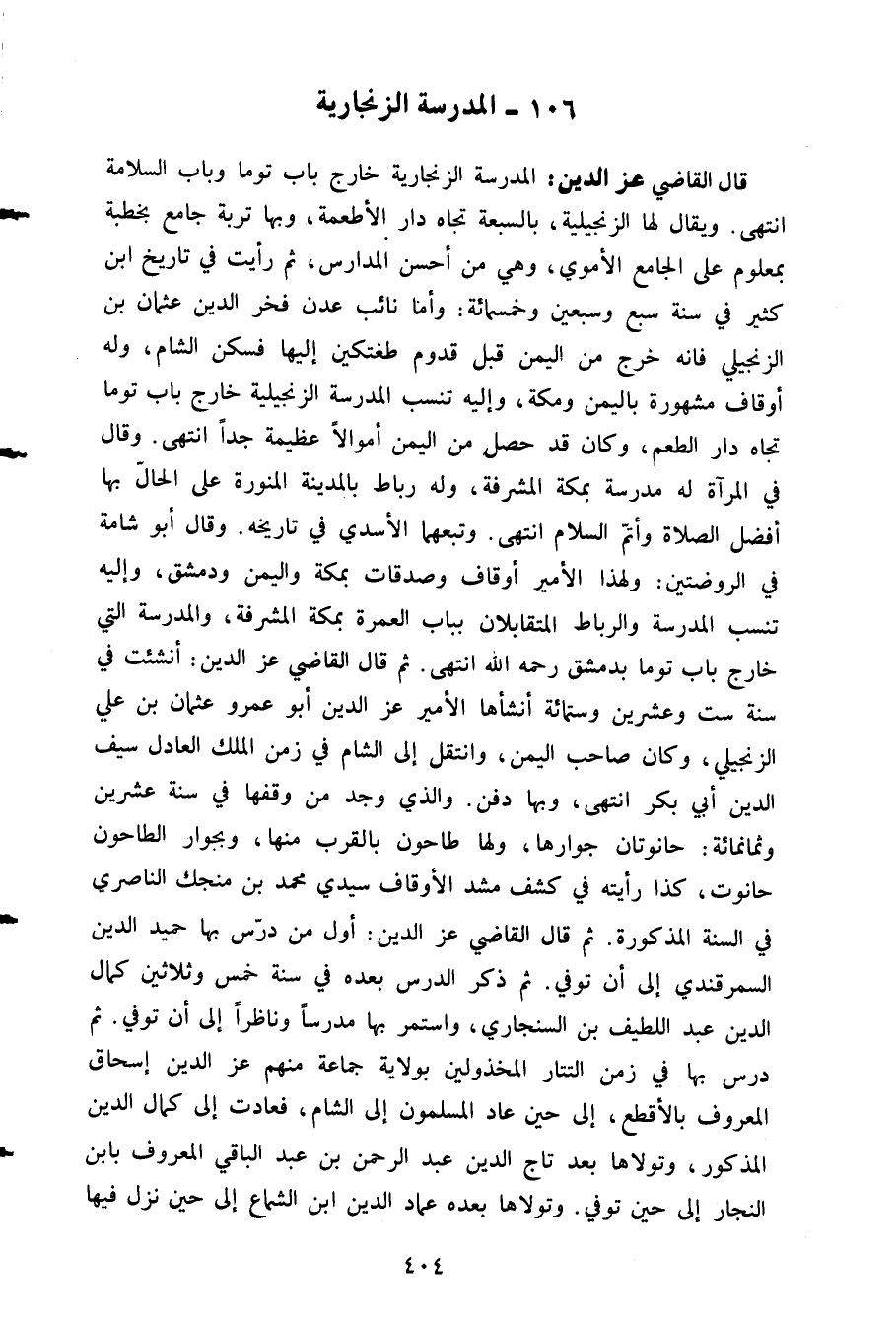 قال القاضي عزالدين المدرسة الزنجارية خارج باب توما وباب السلامة انتهى. ويقال لها الزنجيلي بالسبعة تجاه دار الأطعمة وبها تربة جامع بخطبة بمعلوم على الجامع الأموي وهي من أحسن المدارس ثم رأيت في تاريخ ابن كثير في سنه سبع وسبعين وخمسمائة وأما نائب عدن فخر الدين عثمان بن الزنجيلي فإنه خرج من اليمن قبل قدوم طغتكين إليها فسكن الشام وله أوقاف مشهورة باليمني ومكة واليه تنسب المدرسة الزنجيلية خارج باب توما تجاه دار الطعم وكان قد حصل من اليمن أموالا عظيمة جدا انتهى. وقال في المرآة له مدرسة بمكة المشرفة وله رباط بالمدين المنورة على الحال بها أفضل الصلاة وأتم السلام انتهى. وتبعهما الأسدي في تاريخه وقال أبو شامة في الروضتين: ولهذا الأمير أوقاف وصدقات بمكة واليمن ودمشق واليه تنسب المدرسة والرباط المتقابلان بباب العمرة بمكة المشرفة والمدرسة التي خارج باب توما بدمشق رحمه الله انتهى. ثم قال القاضي عزالدين: أنشئت في سنة ست وعشرين وستمائة أنشأها الأمير عزالدين أبو عمرو عثمان بن علي الزنجيلي وكان صاحب اليمن وانتقل إلى الشام في زمن الملك العادل سيف الدين أبي بكر انتهى. وبها دفن والذي وجد من وقفها في سنة عشرين وثمانمائة حانوتان جوارها ولها طاحون بالقرب منها وبجوار الطاحون حانوت كذا رأيته في كشف مشد الأوقاف شيدي محمد بن منجك الناصري في السنة المذكورة ثم قال: القاضي عزالدين أول من درس بها حميد الدين السمرقندي إلى أن توفي ثم ذكر الدرس بعده في سنة خمس وثلاثين كمال الدين عبد اللطيف بن السنجاري واستمر بها مدرسا وناظرا إلى أن توفي ثم درس بها في زمن التتار المخذولين بولاية جماعة منهم عزالدين إسحاق المعروف بالأقطع إلى حين عاد المسلمون إلى الشام فعادت إلى كمال الدين المذكور وتولاها بعد تاج الدين عبد الرحمن بن عبد الباقي المعروف بابن النجار إلى حين توفي وتولاها بعده عماد الدين ابن الشماع إلى حين نزل فيها