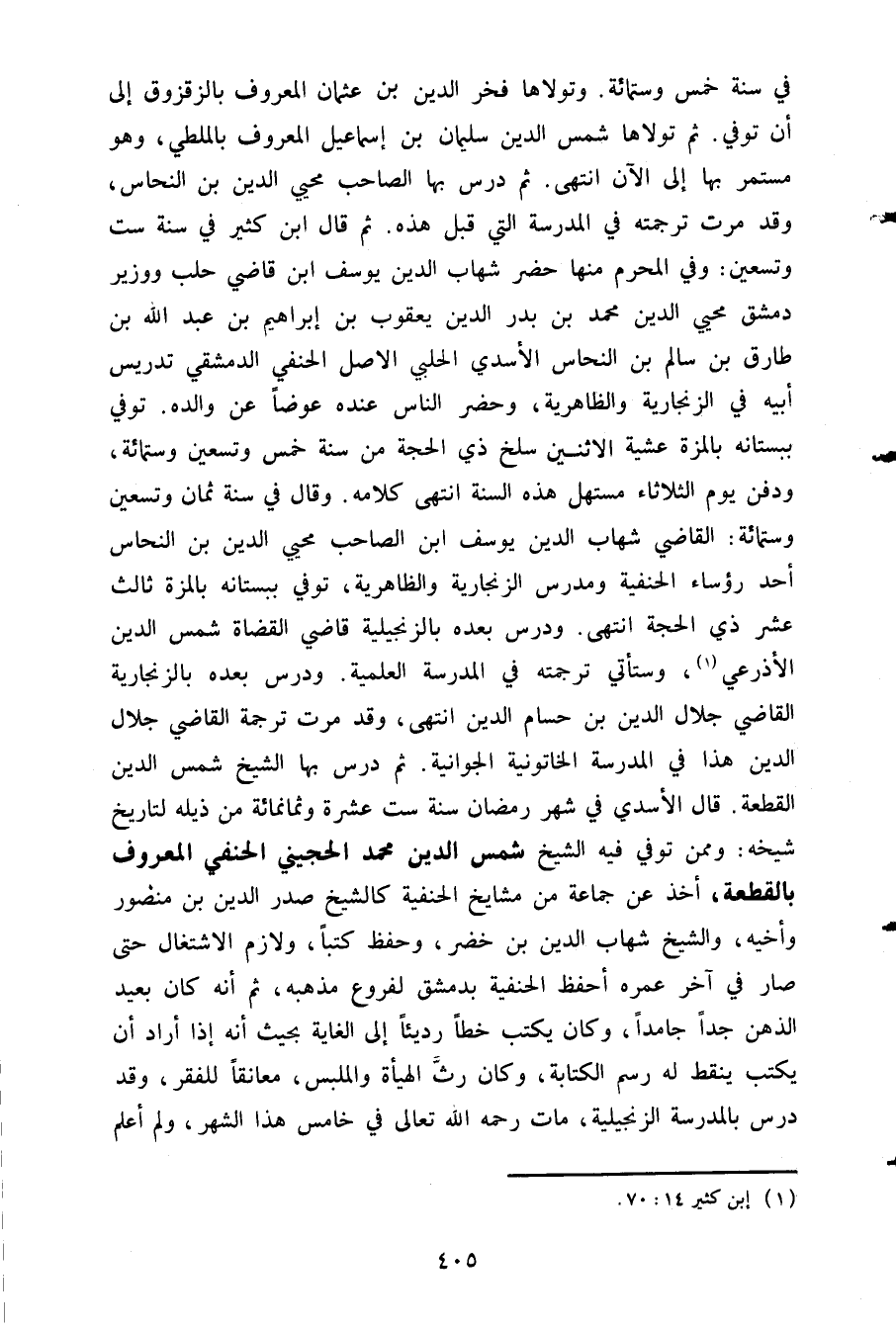في سنة خمس وستمائة وتولاها فخر الدين بن عثمان المعروف بالزقزوق إلى أن توفي ثم تولاها شمس الدين سليمان بن إسماعيل المعروف بالملطي وهو مستمر بها إلى الآن انتهى. ثم درس بها الصاحب محيي الدين بن النحاس وقد مرت ترجمته في المدرسة التي قبل هذه ثم قال ابن كثير في سنة ست وتسعين: وفي المحرم منها حضر شهاب الدين يوسف ابن قاضي حلب ووزير دمشق محيي الدين محمد بن بدر الدين يعقوب بن إبراهيم بن عبد الله بن طارق بن سالم بن النحاس الأسدي الحلبي أصل الحنفي الدمشقي تدريس أبيه في الزنجارية والظاهرة وحضر الناس عنده عوضا عن والده توفي ببستانه بالمزة عشية الإثنين سلخ ذي الحجة من سنة خمس وتسعين وستمائة ودفن يوم الثلاثاء مستهل هذه السنة انتهى كلامه. وقال في سنة ثمان وتسعين وستمائة: القاضي شهاب الدين يوسف ابن الصاحب محيي الدين بن النحاس أحد رؤساء الحنفية ومدرس الزنجارية الظاهرية توفي ببستانه بالمزو ثالث عشر ذي الحجة انتهى. ودرس بعده بالزنجيلية قاضي القضاة شمس الدين الأذرعي1 وستأتي ترجمته في المدرسة العلمية ودرس بعده بالزنجارية القاضي جلال الدين بن حسام الدين انتهى. وقد مرت ترجمته القاضي جلال الدين هذا في المدرسة الخاتونية الجوانية ثم درس بها الشيخ شمس الدين القطعة. قال الأسدي في شهر رمضان سنة ست عشرة وثمانمائة من ذيله لتاريخ شيخه: وممن توفي فيه الشيخ شمس الدين محمد الحجيني الحنفي المعروف بالقطعة أخذ عن جماعة من مشايخ الحنفية كالشيخ صدر الدين بن منصور وأخيه والشيخ شهاب الدين بن خضر وحفظ كتابا ولازم الاشتغال حتى صار في آخر عمره أحفظ الحنفية بدمشق لفروع مذهبه ثم أنه كان بعيد الذهن جدا جامدا وكان يكتب خطا رديئا إلى الغاية بحيث أنه إذا أراد أن يكتب ينقط له رسم الكتابة وكان رث الهيأة والملبس معانقا للفقر وقد درس بالمدرسة الزنجيلية مات رحمه الله تعالى في خامس هذا الشهر ولم أعلم