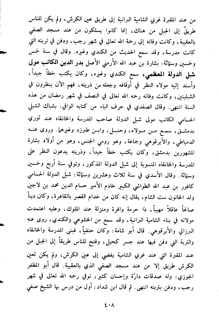 من عند المقبرة غربي الشامية البرانية إلى طريق عين الكرش ولم يكن للناس طريق إلى الجبل من هناك إنما كانوا يسلكون من عند مسجد الصفي بالعقيبة وكانت وفاته إلى رحمة الله تعالى في شهر رجب ودفن في تربته التي كانت مدرسة وقد سمع الحديث من الكندري وغيره وقال في سنة خمس وخمسين وستمائة بشارة بن عبد الله الأرمني الأصل بدر الدين الكاتب مولى شبل الدولة المعظمي سمع الكندي وغيره وكان يكتب خطا جيدا وأسند إليه مولاه النظر في أوقافه وجعله من ذريته فهم الآن ينظرون في الشبلتين وكانت وفاته رحمه الله تعالى في النصف في شهر رمضان من هذه السنة انتهى وقال الصفدي في حرف الباء من كتابه الوافي بشباك الشبلي الحسامي الكاتب مولى شبل الولة صاحب المدرسة والخانقاه عند ثوري بدمشق سمع من مولاه وحنبل وابن طبرزد وغيرهما وروى عنه الدمياطي والأبرقوهي وجماعة وهو رومي الجنس وهو من أولاد بشارة المشهورين بدمشق وكان يكتب خطا جيدا وذريته يدعون النظر على المدرسة والخانقاه المنسوبة إلى شبل الدولة المذكور وتوفي سنة أربع وخمسين وستمائة وقال الأسدي في سنة ثلاث وعشرين وستمائة شبل الدولة الحسامي كافور بن عبد الله الطواشي الكبير خادم الأمير حسام الدين محمد بن لاجين ولد الخاتون ست الشام يقال إنه كان من خدام القصر بالقاهرة وكان دينا صالحا عاقلا مهيبا ذا حرمة وافرة ومنزلة عند الملوك وعليه اعتمدت مولاته في بناء الشامية البرانية وقد سمع من الخشوعي والكندي روى عنه البرزالي والأبرقوهي قال أبو شامة وكان حنفيا فبنى المدرسة واللخانقاه والتربة التي دفن فيها عند جسر كحيل وفتح للناس طريقا إلى الجبل من عند المقبرة التي عند غربي الشامية يفضي إلى عين الكرش ولم يكن لعين الكرش طريق إلا من عند مسجد الصفي الذي بالعقيبة قال أبو المظفر الجوزي وله صدقات دارة وإحسان كثير توفي رحمه الله تعالى في شهر رجب ودفن بتربته انتهى ثم قال ابن شداد أول من درس بها الشيخ الصفي