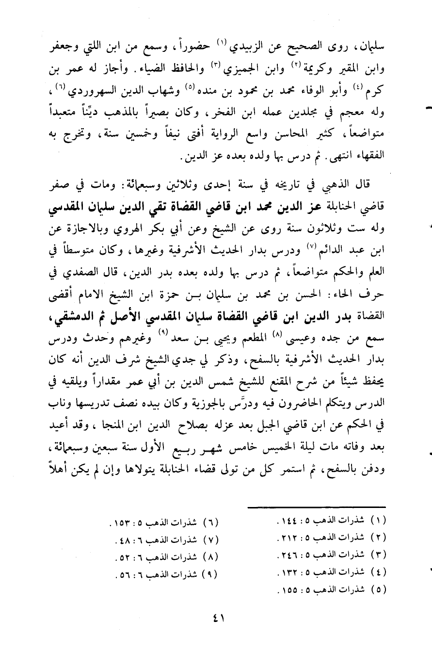قال الذهبي في تاريخه في سنة إحدى وثلاثين وسبعمائة ومات في صفر قاضي الحنابلة عز الدين محمد ابن قاضي القضاة تقي الدين سليمان المقدسي وله ست وثلاثون سنة روى عن الشيخ وعن أبي بكر الهروي وبالإجازة عن ابن عبد الدائم7 ودرس بدار الحديث الاشرفية وغيرها وكان متوسطا في العلم والحكم متواضعا ثم درس بها ولده بعده بدر الدين قال الصفدي في حرف الحاء: الحسن بن محمد بن سليمان بن حمزة ابن الشيخ الإمام أقضى القضاة بدر الدين ابن قاضي القضاة سليمان المقدسي الأصل ثم الدمشقي، سمع من جده وعيسى8 المطعم ويحيى بن سعد9 وغيرهم وحدث ودرس بدار الحديث الأشرفية بالسفح وذكر لي جدي الشيخ شرف الدين أنه كان يحفظ شيئا من شرح المقنع للشيخ شمس الدين بن أبي عمر مقدارا ويلقيه في الدرس ويتكلم الحاضرون فيه ودرس بالجوزية وكان بيده نصف تدريسها وناب في الحكم عن ابن قاضي الجبل بعد عزله بصلاح الدين ابن المنجا وقد أعيد بعد وفاته مات ليلة الخميس خامس شهر ربيع الأول سنة سبعين وسبعمائة ودفن بالسفح ثم استمر كل من تولى قضاء الحنابلة يتولاها وإن لم يكن أهلاً