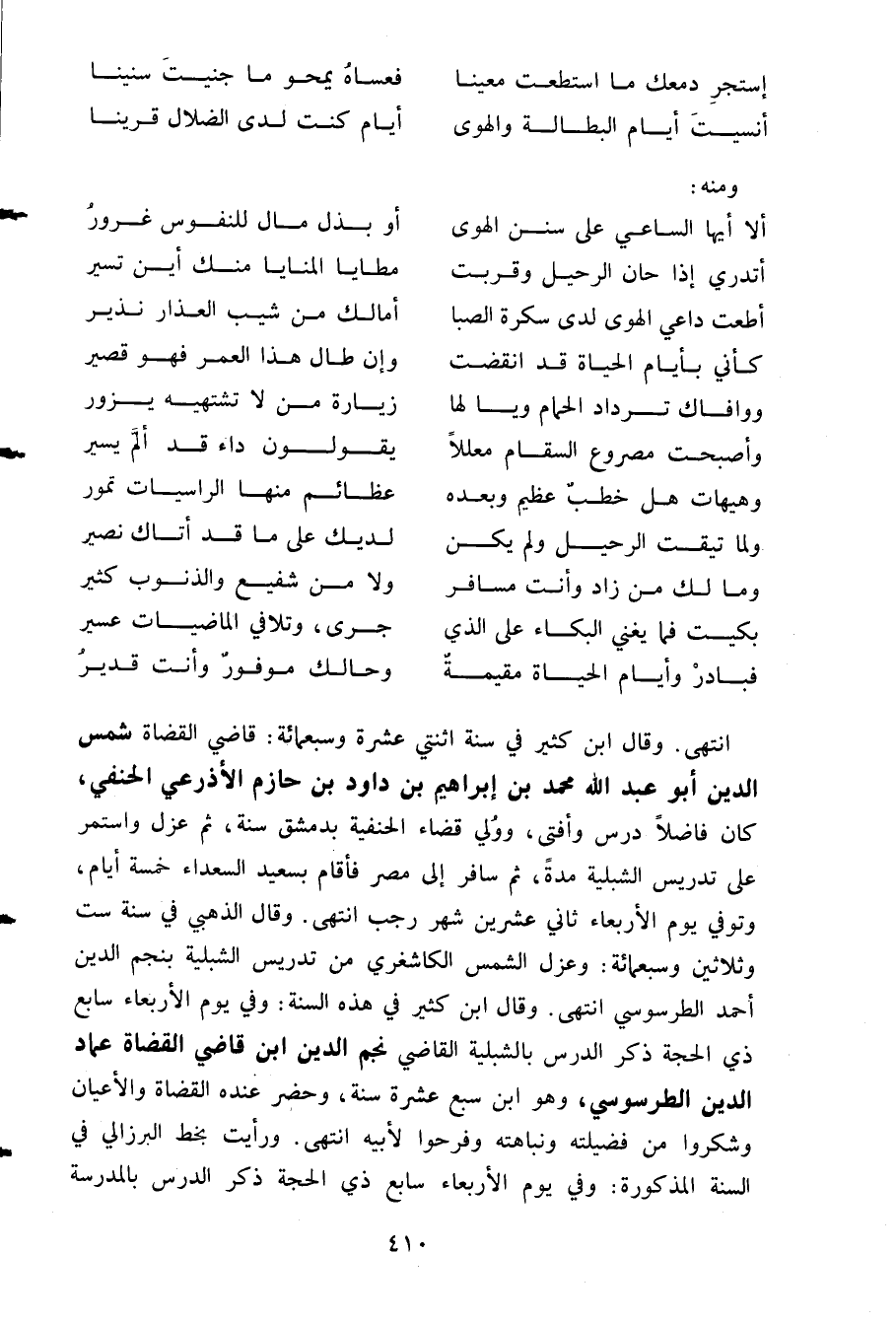وقال ابن كثير في سنة اثنتي عشرة وسبعمائة قاضي القضاة شمس الدين أبو عبد الله محمد بن إبراهيم بن داود بن حازم الذرعي الحنفي كان فاضلا درس وأفتى وولي قضاء الحنفية بدمشق سنة ثم عزل واستمر على تدريس الشبلية مدة ثم سافر إلى مصر فأقام بسعيد السعداء خمسة أيام وتوفي يوم الأربعاء ثاني عشرين شهر رجب انتهى وقال الذهبي في سنة ست وثلاثين وسبعمائة وعزل الشمس الكاشغري من تدريس الشبلية بنجم الدين أحمد الطرسوسي انتهى وقال ابن كثير في هذه السنة وفي يوم الأربعاء سابع ذي الحجة ذكر الدرس بالشبلية القاضي نجم الدين ابن قاضي القضاة عماد الدين الطرسوسي وهو ابن سبع عشرة سنة وحضر عنده القضاة والأعيان وشكروا فضيلته ونباهته وفرحوا لأبيه انتهى ورأيت بخط البرزالي في السنة المذكورة وفي يوم الأربعاء سابع ذي الحجة ذكر الدرس بالمدرسة